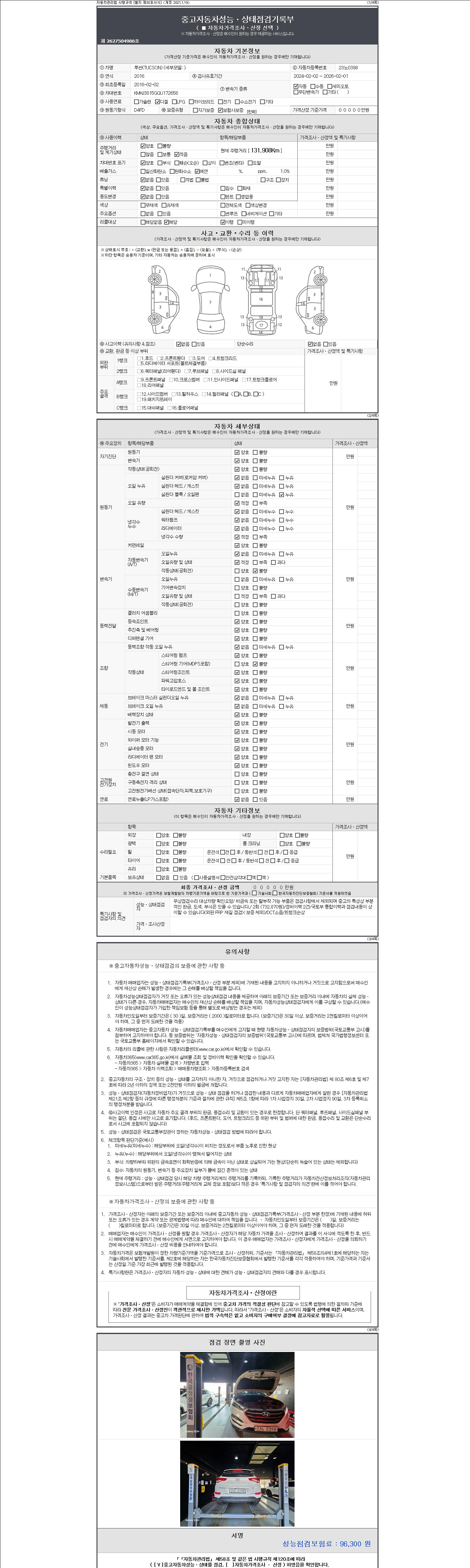 | 주행거리 | 131,908 km | 차량번호 | 23노0398 | 사고유무 | 성능기록부 참조 | 제시번호 | 제 2147483647 호 |