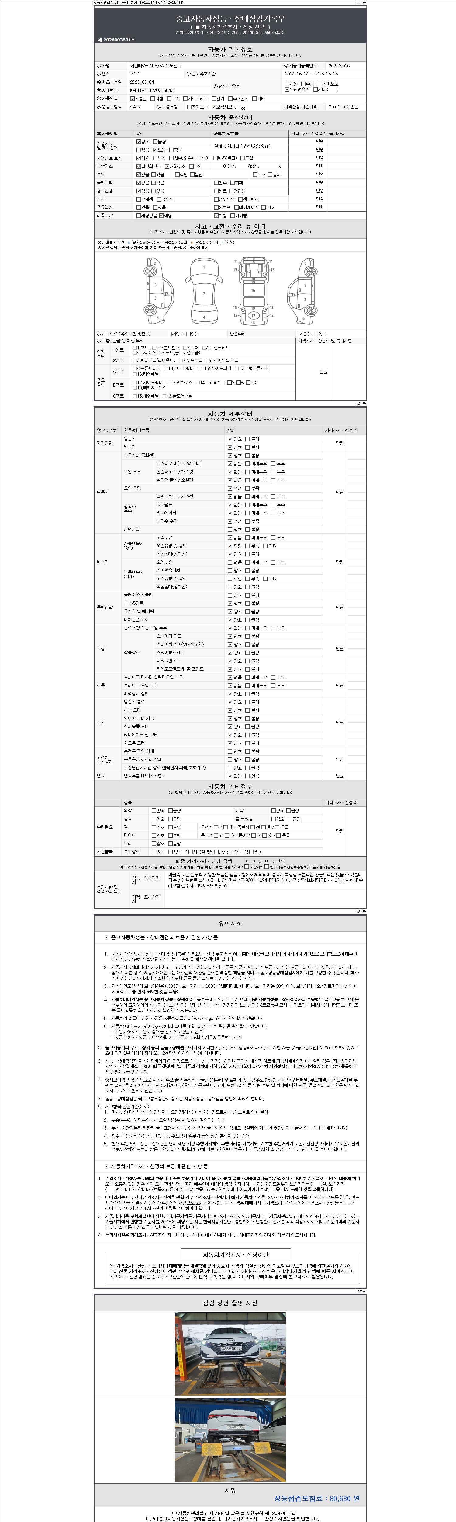 | 주행거리 | 72,083 km | 차량번호 | 366루5006 | 사고유무 | 성능기록부 참조 | 제시번호 | 제 2147483647 호 |