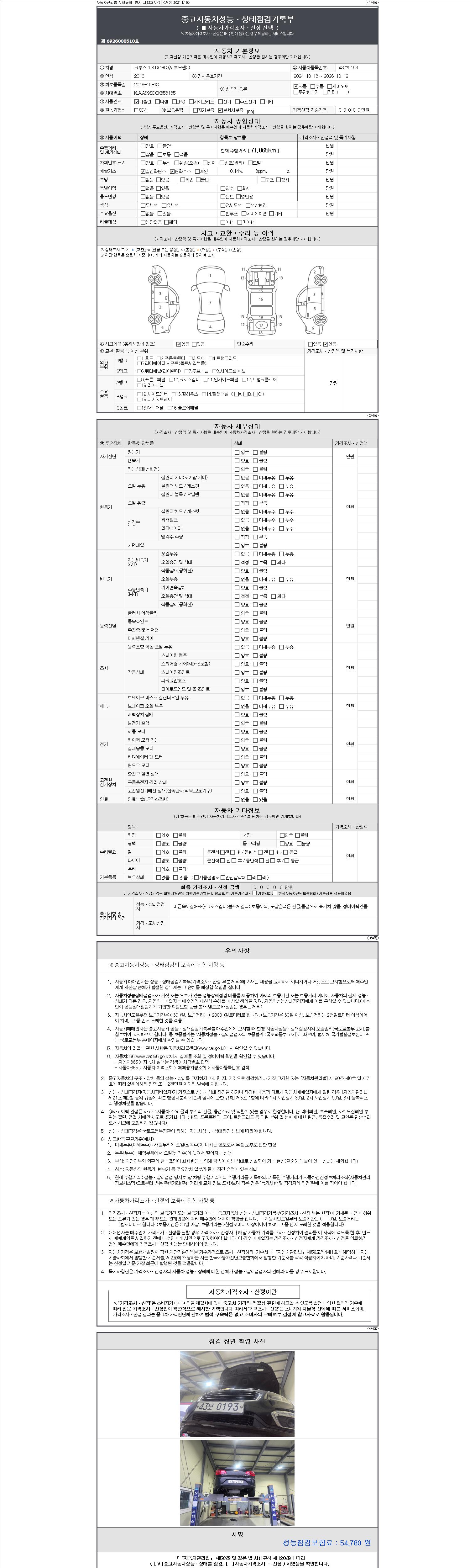 | 주행거리 | 71,065 km | 차량번호 | 43보0193 | 사고유무 | 성능기록부 참조 | 제시번호 | 제 2147483647 호 |