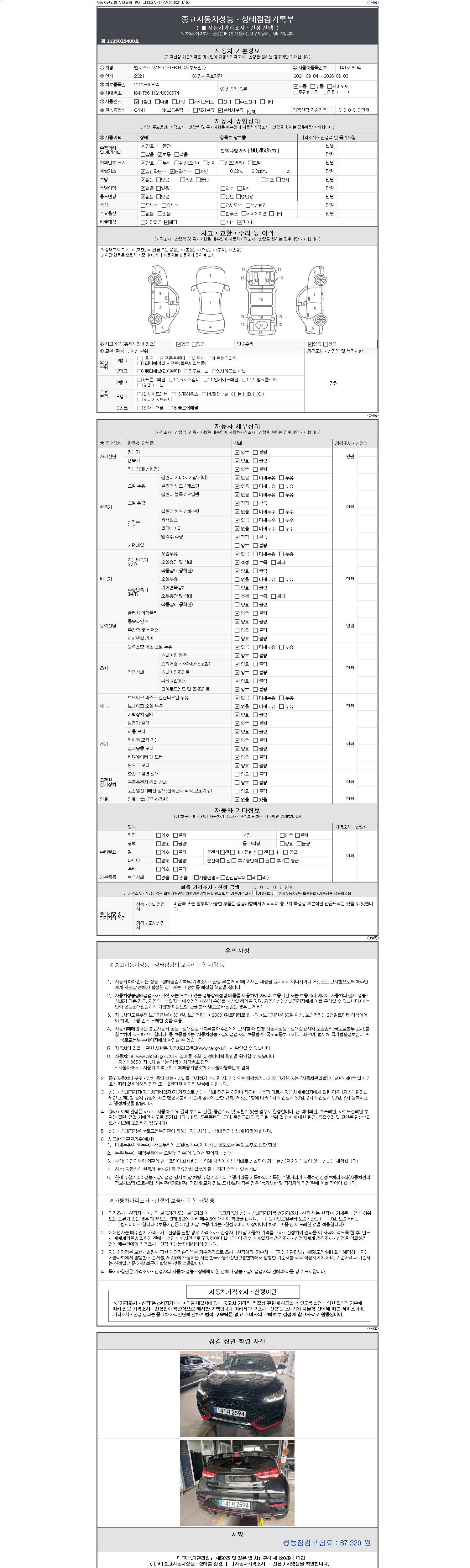 | 주행거리 | 90,458 km | 차량번호 | 141서2594 | 사고유무 | 성능기록부 참조 | 제시번호 | 제 2147483647 호 |