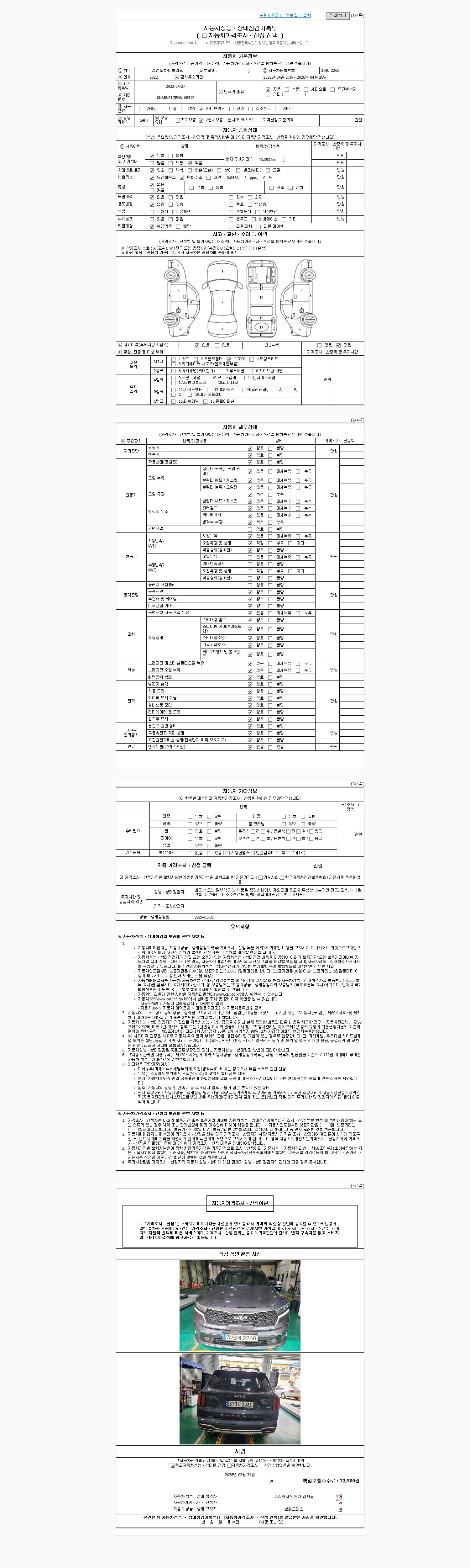 자동차관리법 시행규칙 제120조의 규정에 따라 별지 제 82호서식 《중고자동차 성능, 상태점검 기록부》를 발행한 성능, 상태점검자 및 매매자는 아래의 보증기간 또는 보증거리 이내의 중고자동차, 성능점검 기록부에 기재된 내용과 자동차의 실제 성능, 상태가 다른 경우 계약 또는 관계법령에 따라 매수인에 대하여 책임을 집니다.