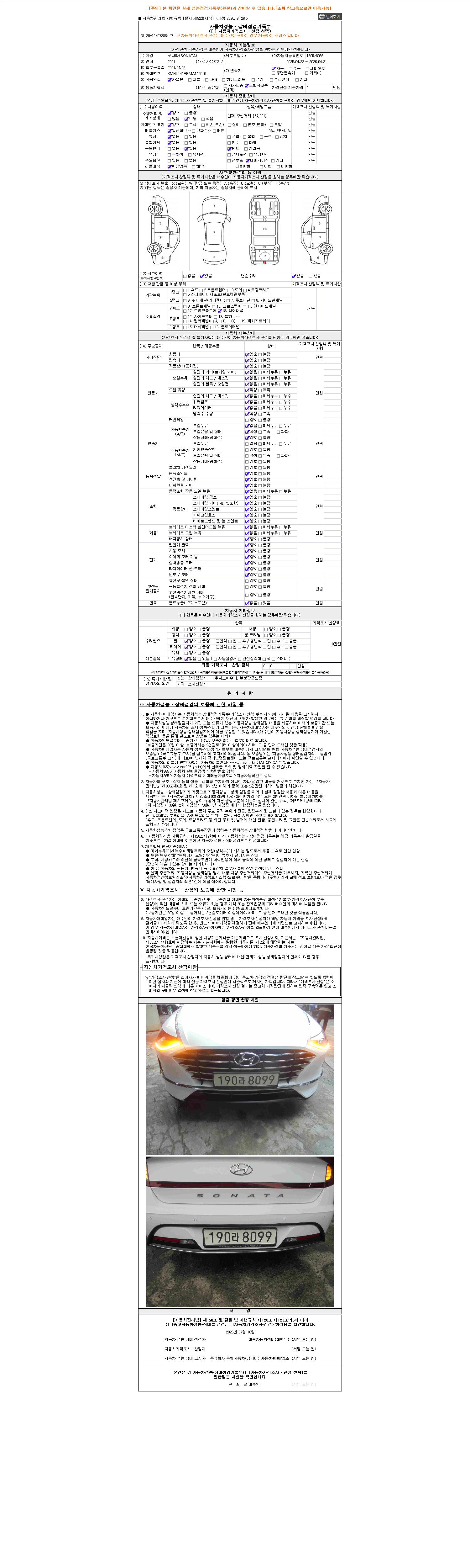 자동차관리법 시행규칙 제120조의 규정에 따라 별지 제 82호서식 《중고자동차 성능, 상태점검 기록부》를 발행한 성능, 상태점검자 및 매매자는 아래의 보증기간 또는 보증거리 이내의 중고자동차, 성능점검 기록부에 기재된 내용과 자동차의 실제 성능, 상태가 다른 경우 계약 또는 관계법령에 따라 매수인에 대하여 책임을 집니다.