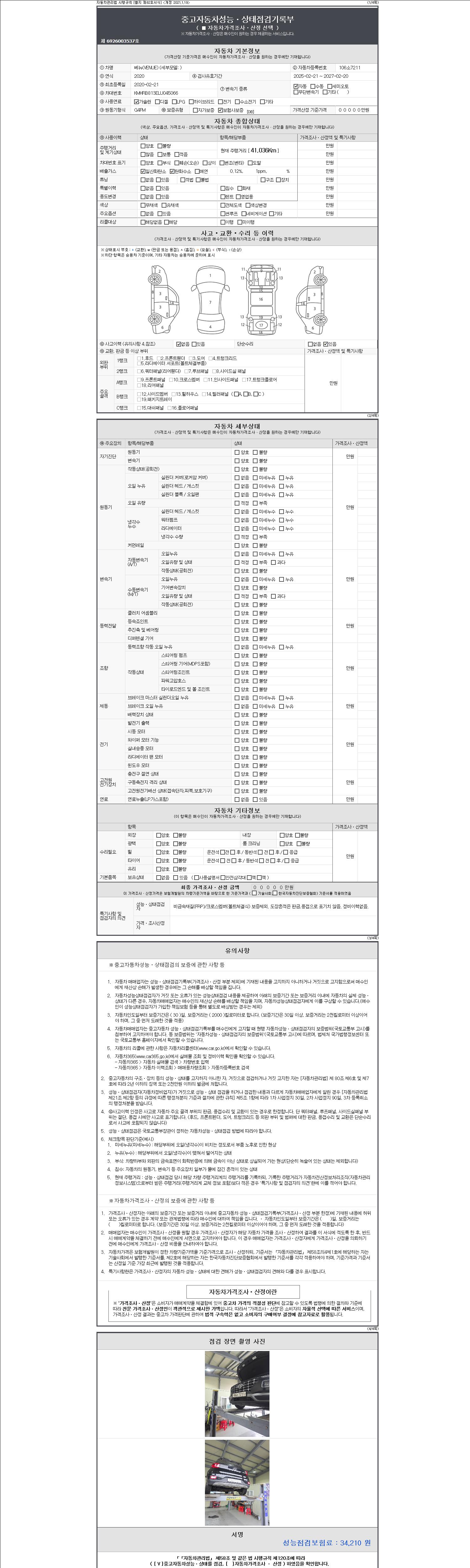 | 주행거리 | 41,036 km | 차량번호 | 106소7211 | 사고유무 | 성능기록부 참조 | 제시번호 | 제 2147483647 호 |