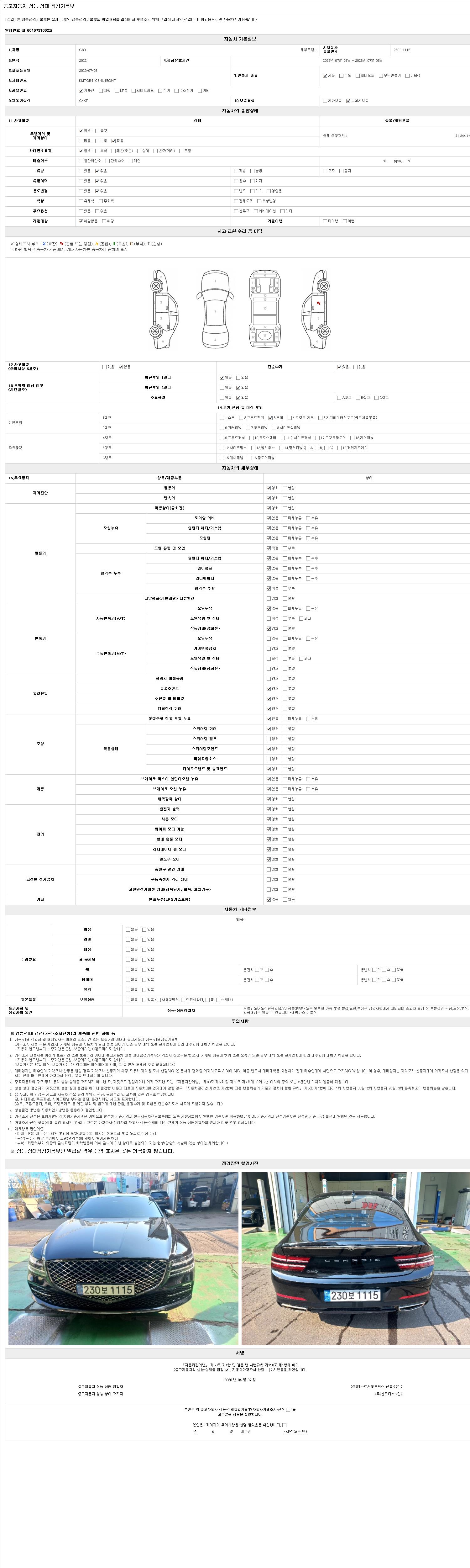 | 주행거리 | 41,344 km | 차량번호 | 230보1115 | 사고유무 | 성능기록부 참조 | 제시번호 | 제 2026011244 호 |