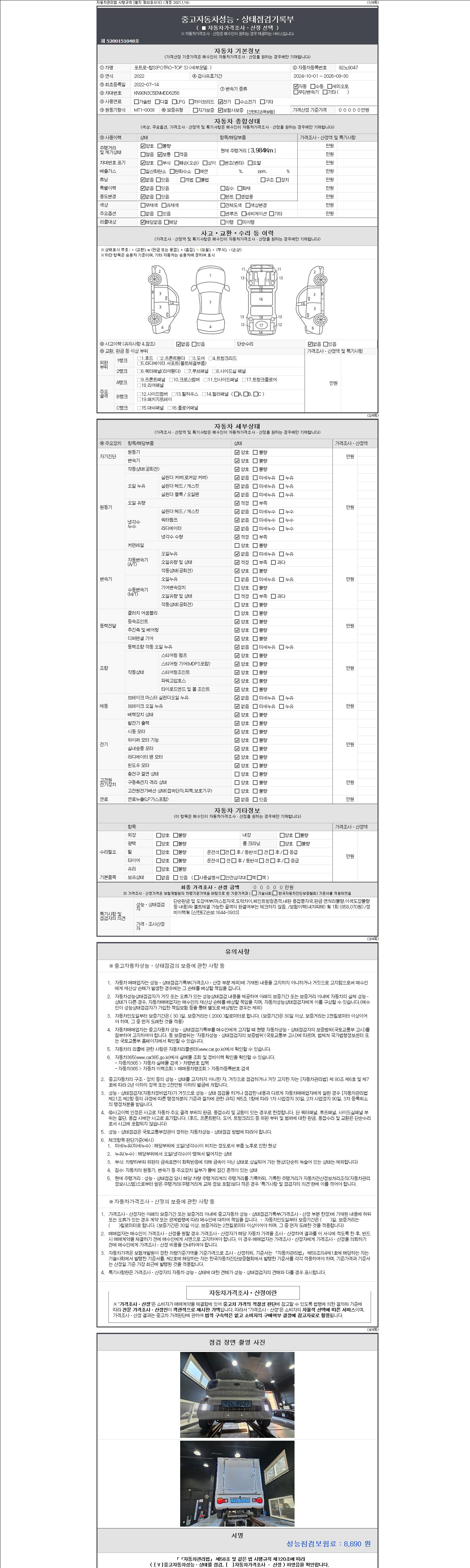 -중고자동차 매매업자를 통해 차량을 구입하실 경우 반드시 "중고자동차 성능, 상태점검 기록부"를 교뷰 받으셔야 하며, 매매업자는 반드시 의무 교부 하여야 압니다.