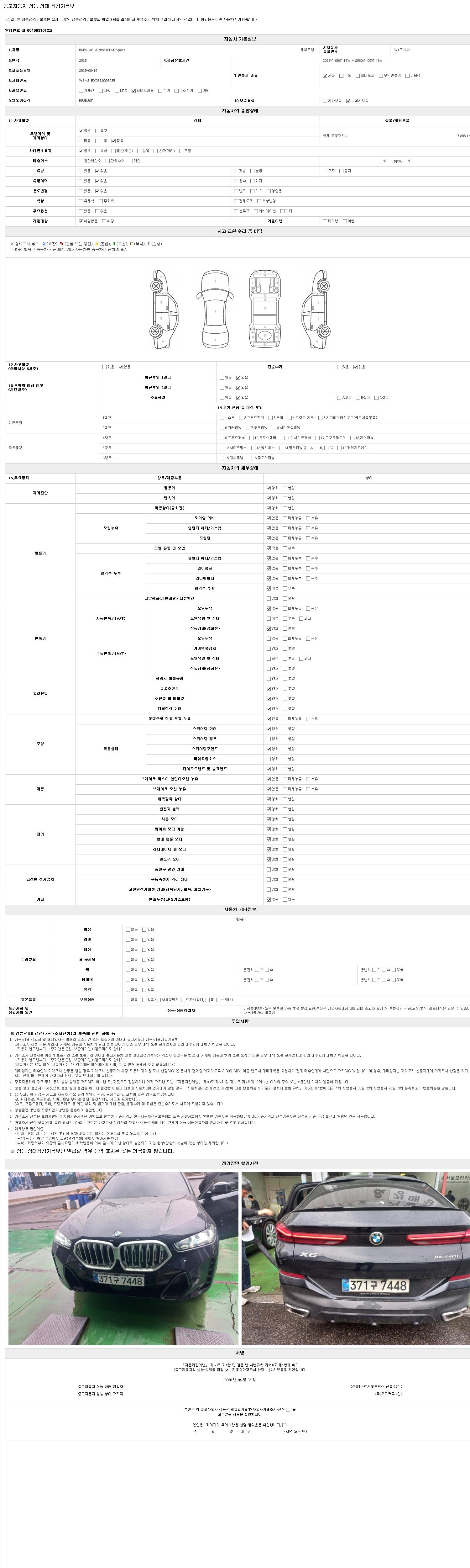 | 주행거리 | 7,893 km | 차량번호 | 371구7448 | 사고유무 | 성능기록부 참조 | 제시번호 | 제 2026011588 호 |