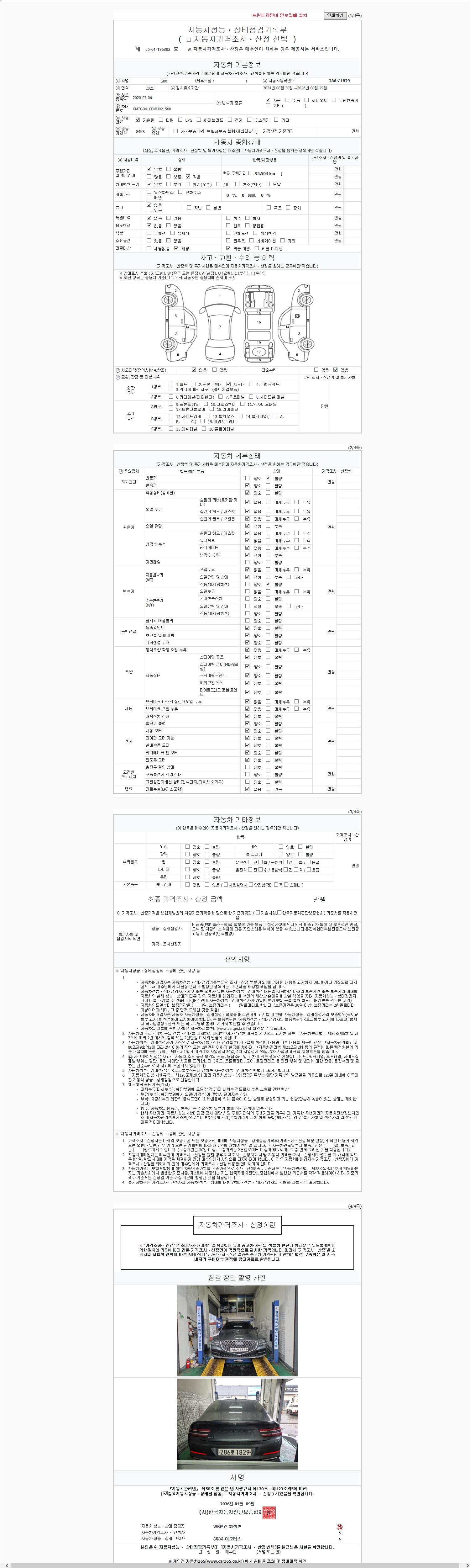 | 주행거리 | 95,504 km | 차량번호 | 286로1829 | 사고유무 | 성능기록부 참조 | 제시번호 | 제 2147483647 호 |