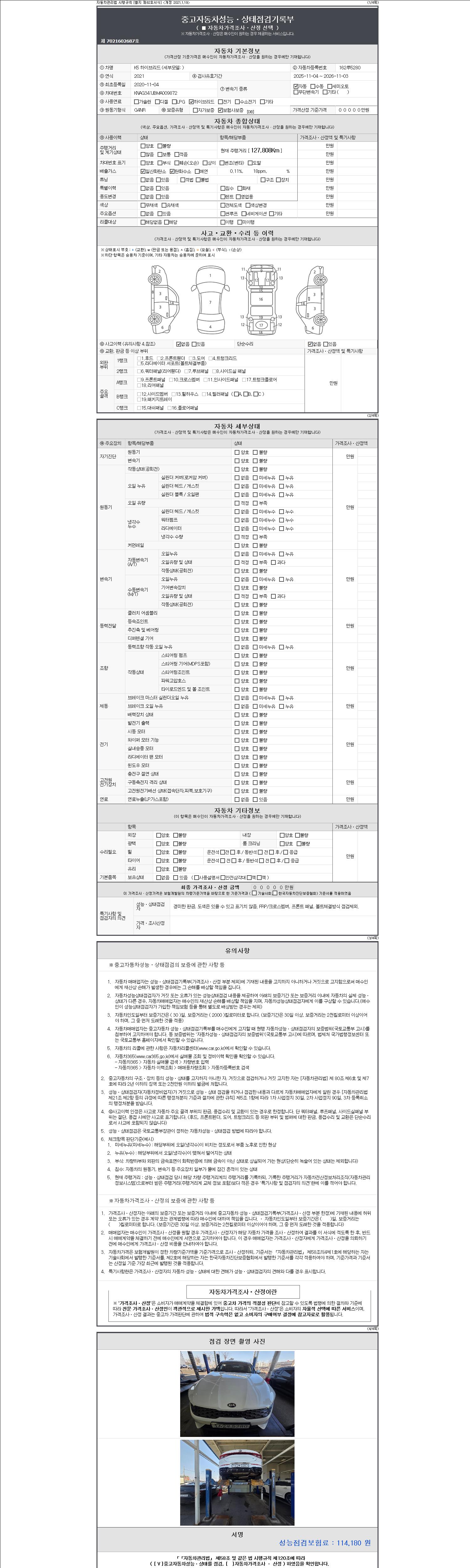 자동차관리법 시행규칙 제120조의 규정에 따라 별지 제 82호서식 《중고자동차 성능, 상태점검 기록부》를 발행한 성능, 상태점검자 및 매매자는 아래의 보증기간 또는 보증거리 이내의 중고자동차, 성능점검 기록부에 기재된 내용과 자동차의 실제 성능, 상태가 다른 경우 계약 또는 관계법령에 따라 매수인에 대하여 책임을 집니다.