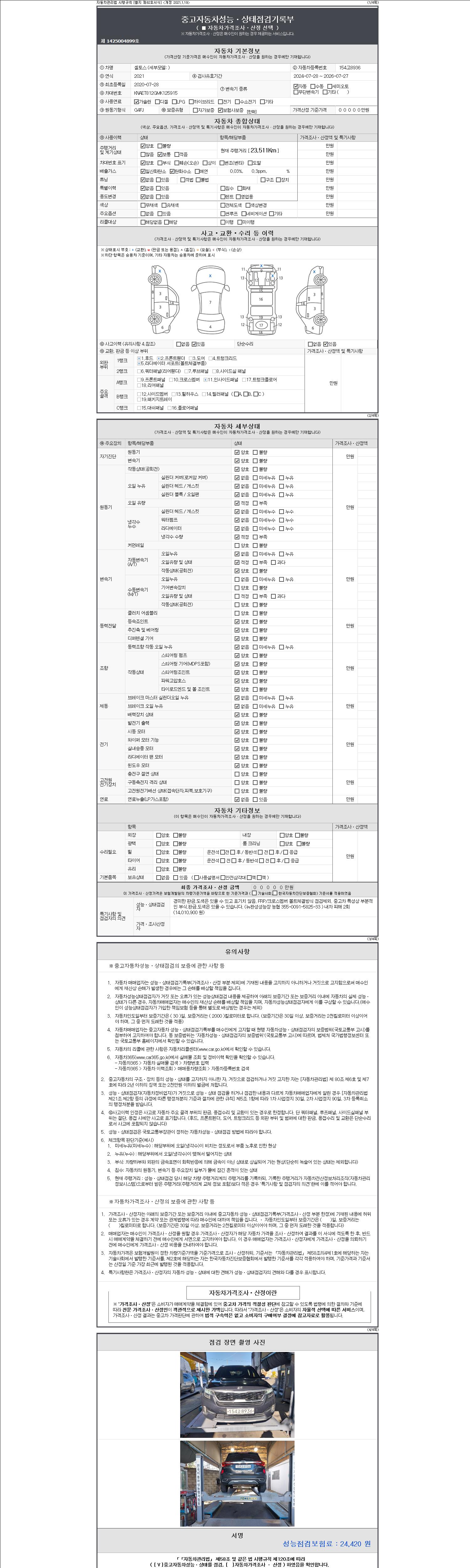| 주행거리 | 23,511 km | 차량번호 | 154고8936 | 사고유무 | 성능기록부 참조 | 제시번호 | 제 2147483647 호 |