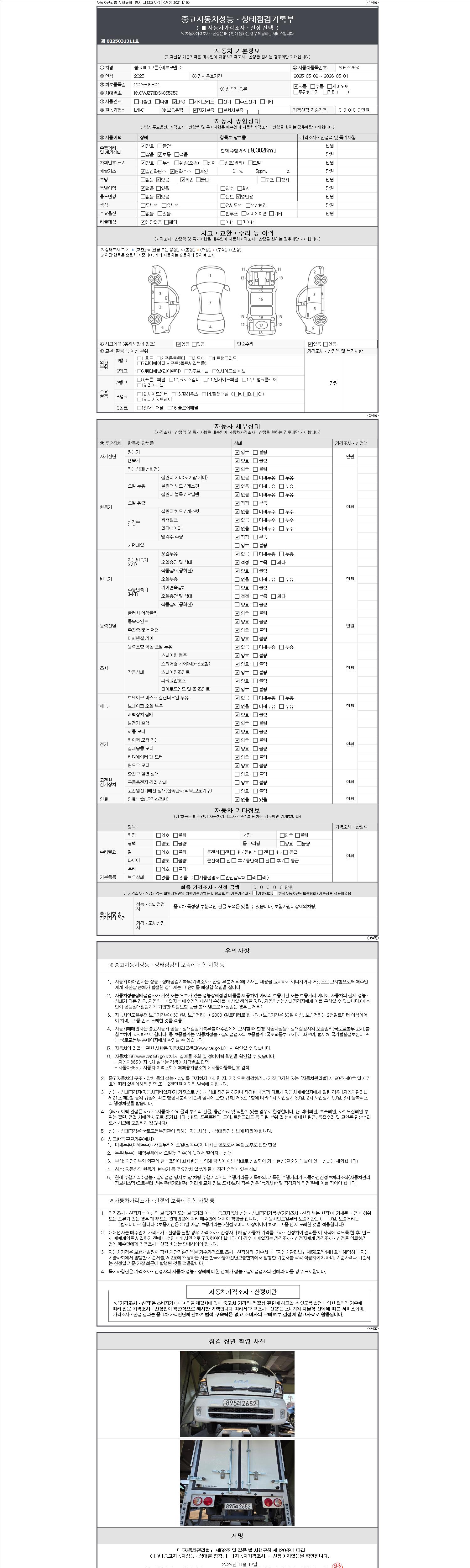 | 주행거리 | 9,382 km | 차량번호 | 895러2652 | 사고유무 | 성능기록부 참조 | 제시번호 | 제 2147483647 호 |