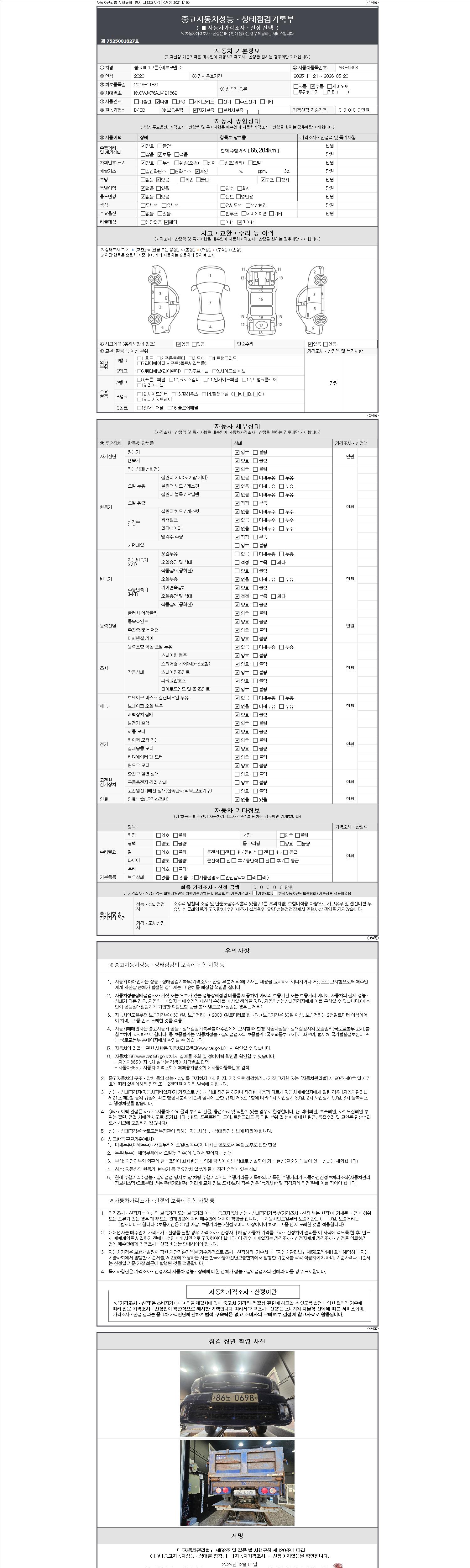 | 주행거리 | 65,204 km | 차량번호 | 86노0698 | 사고유무 | 성능기록부 참조 | 제시번호 | 제 2147483647 호 |