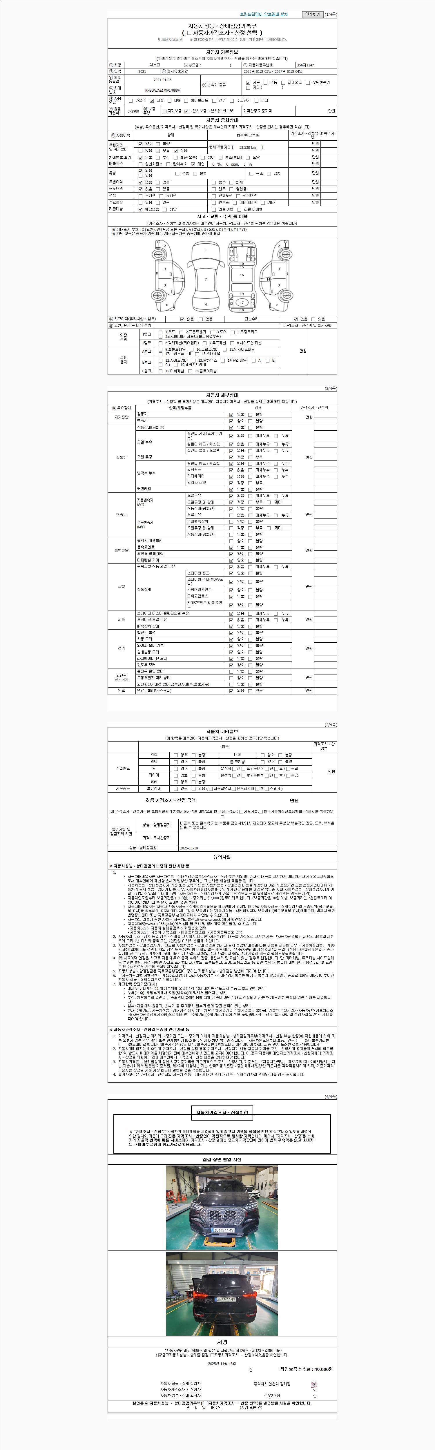 | 주행거리 | 53,538 km | 차량번호 | 356저1147 | 사고유무 | 성능기록부 참조 | 제시번호 | 제 2025063171 호 |