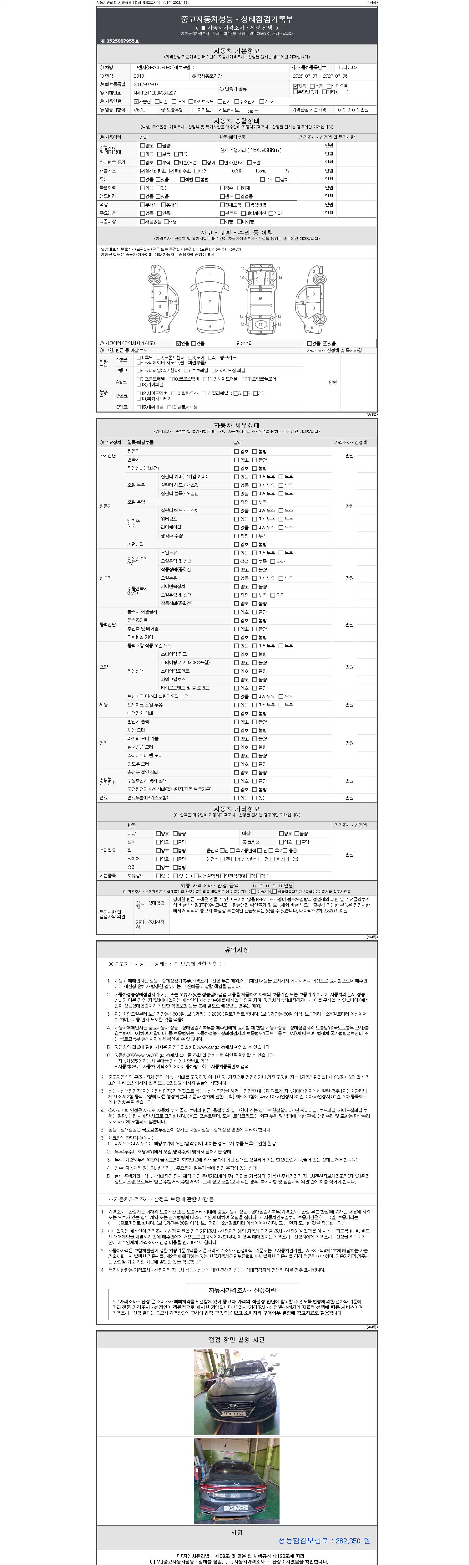 | 주행거리 | 164,938 km | 차량번호 | 10러7062 | 사고유무 | 성능기록부 참조 | 제시번호 | 제 2147483647 호 |