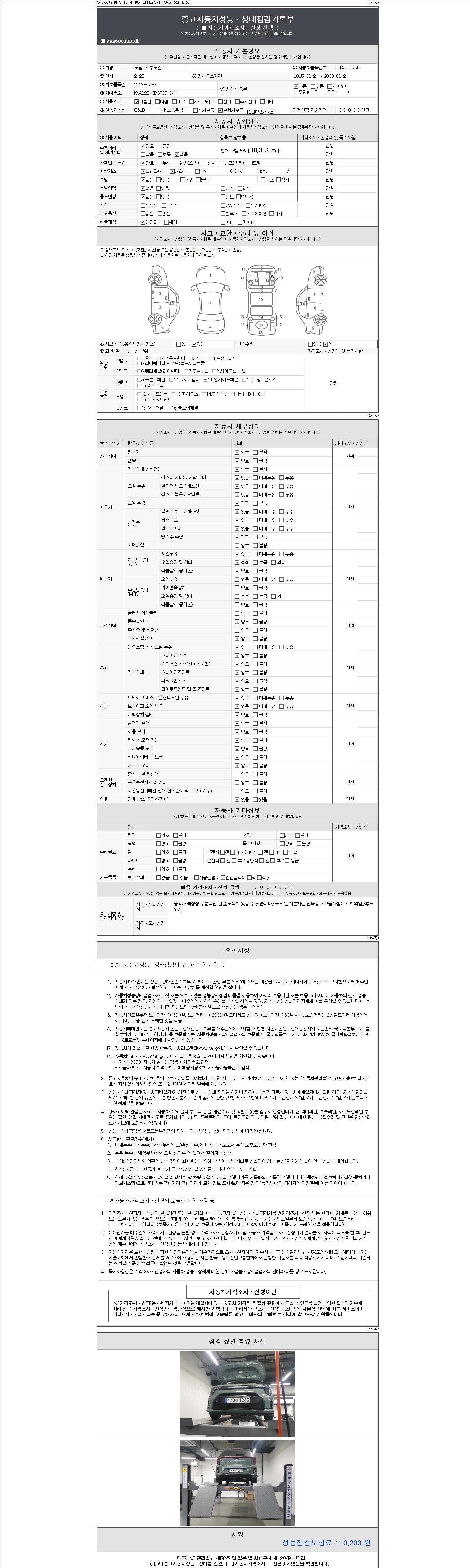 자동차관리법 시행규칙 제120조의 규정에 따라 별지 제 82호서식 《중고자동차 성능, 상태점검 기록부》를 발행한 성능, 상태점검자 및 매매자는 아래의 보증기간 또는 보증거리 이내의 중고자동차, 성능점검 기록부에 기재된 내용과 자동차의 실제 성능, 상태가 다른 경우 계약 또는 관계법령에 따라 매수인에 대하여 책임을 집니다.