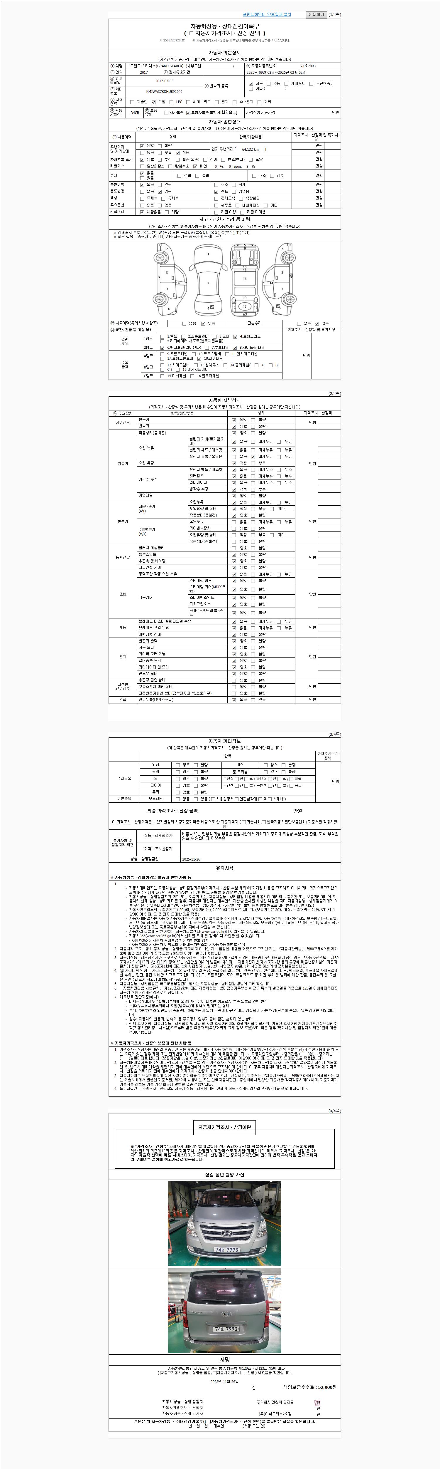 | 주행거리 | 64,142 km | 차량번호 | 77로0379 | 사고유무 | 성능기록부 참조 | 제시번호 | 제 2025067736 호 |