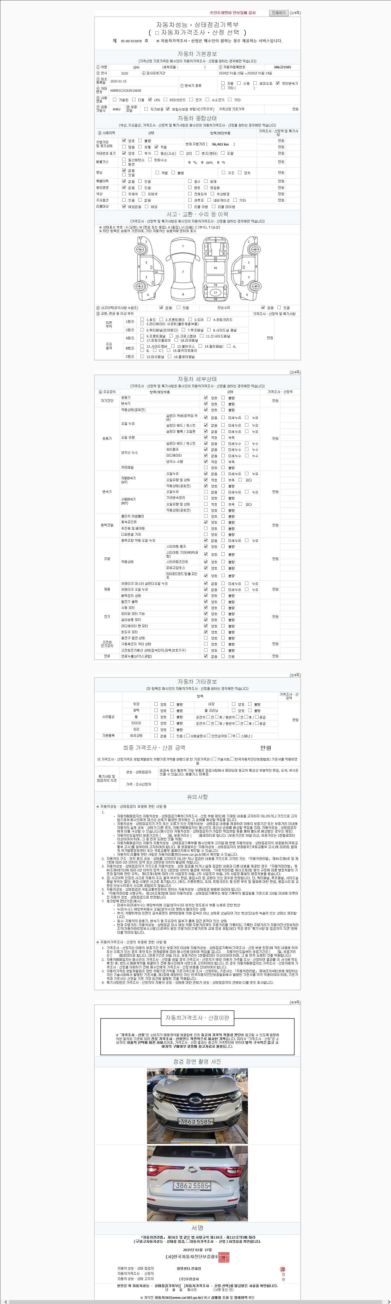 | 주행거리 | 96,402 km | 차량번호 | 386고5585 | 사고유무 | 성능기록부 참조 | 제시번호 | 제 2147483647 호 |