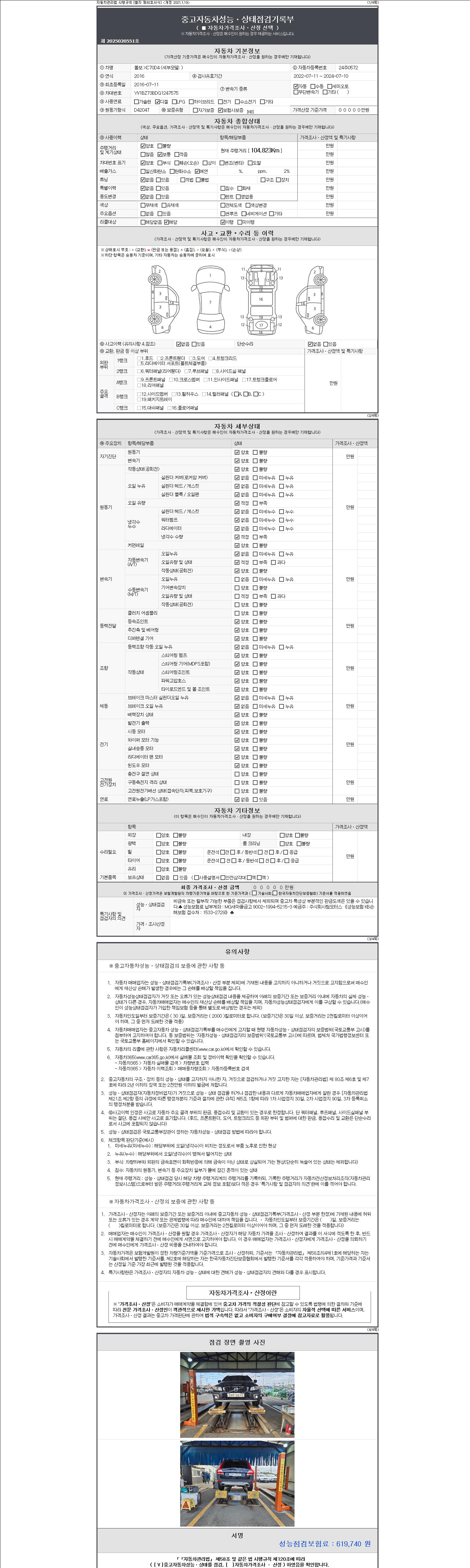 | 주행거리 | 104,796 km | 차량번호 | 24주0572 | 사고유무 | 성능기록부 참조 | 제시번호 | 제 2147483647 호 |