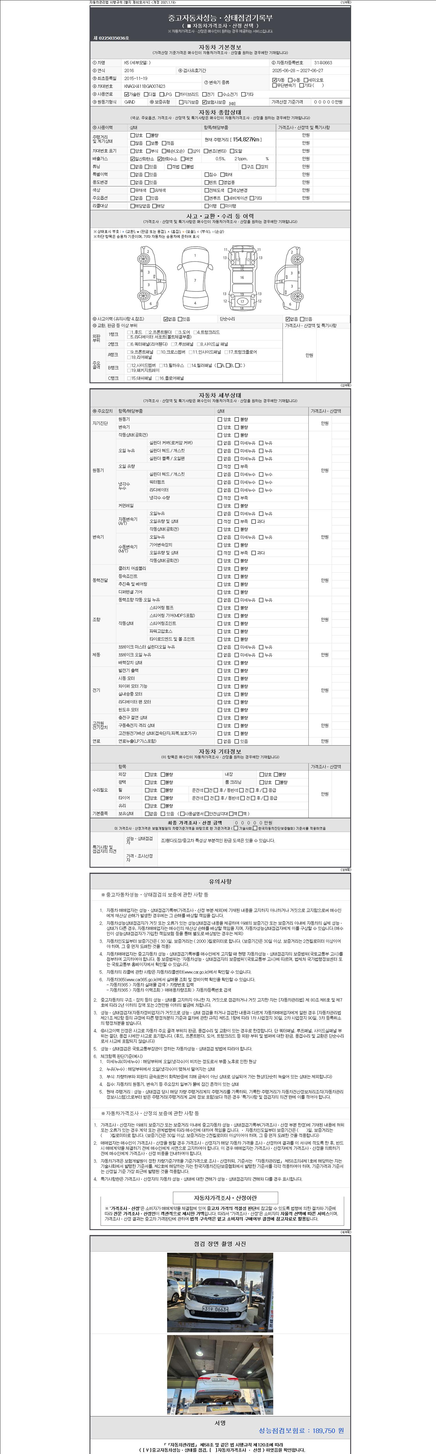 -중고자동차 매매업자를 통해 차량을 구입하실 경우 반드시 "중고자동차 성능, 상태점검 기록부"를 교뷰 받으셔야 하며, 매매업자는 반드시 의무 교부 하여야 압니다.