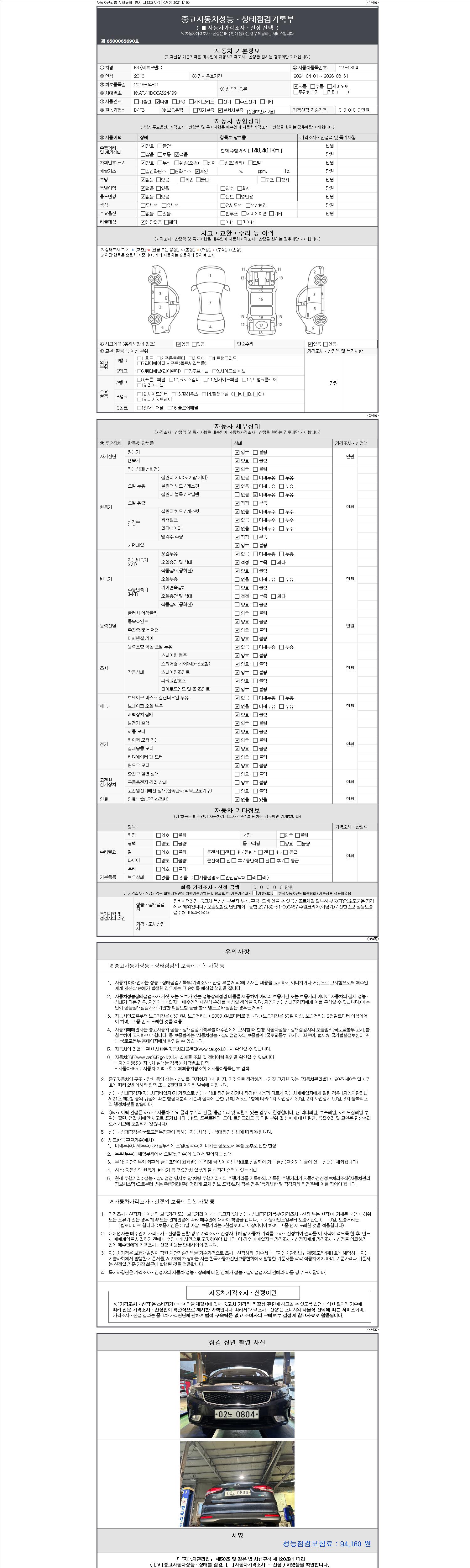 | 주행거리 | 148,401 km | 차량번호 | 02노0804 | 사고유무 | 성능기록부 참조 | 제시번호 | 제 2147483647 호 |