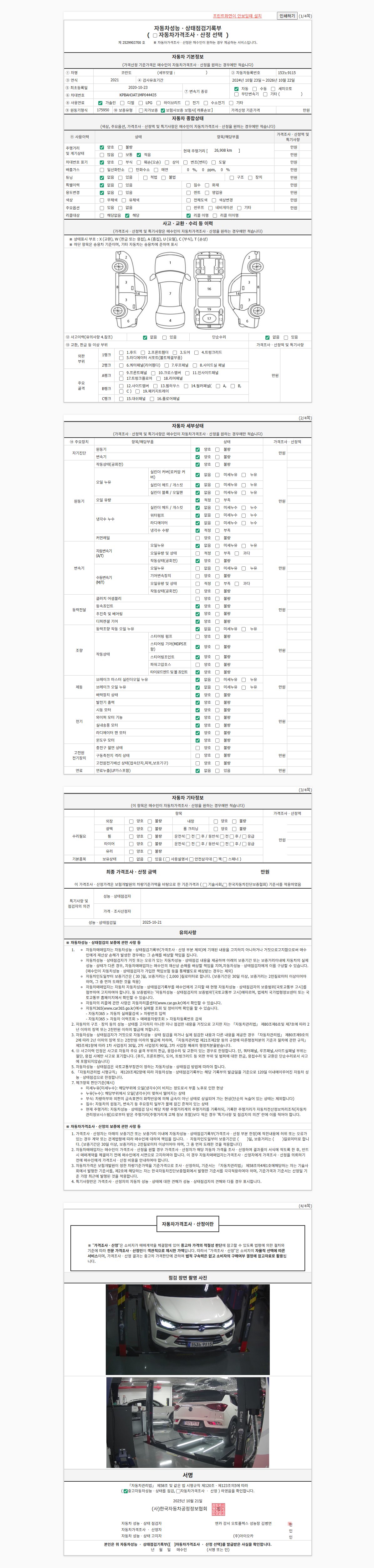 | 주행거리 | 26,909 km | 차량번호 | 153노9115 | 사고유무 | 성능기록부 참조 | 제시번호 | 제 2025141082 호 |
