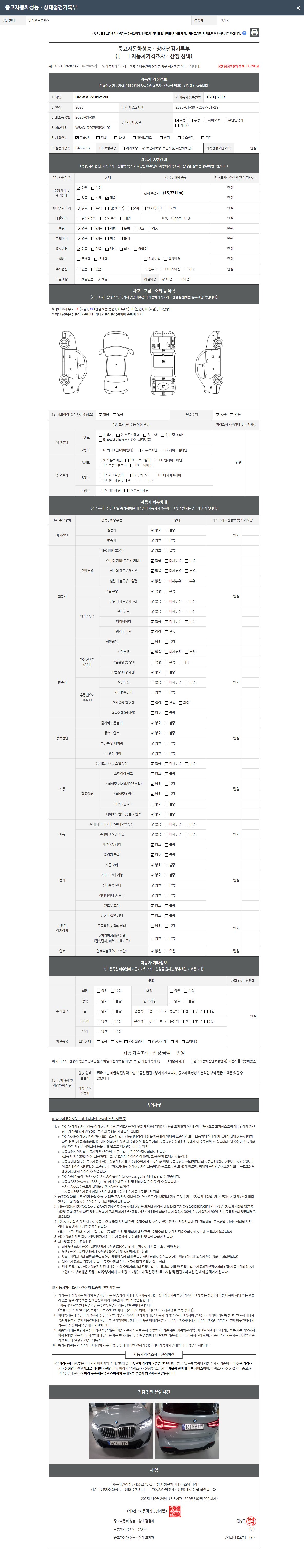 | 주행거리 | 15,371 km | 차량번호 | 161너6117 | 사고유무 | 성능기록부 참조 | 제시번호 | 제 2025143348 호 |