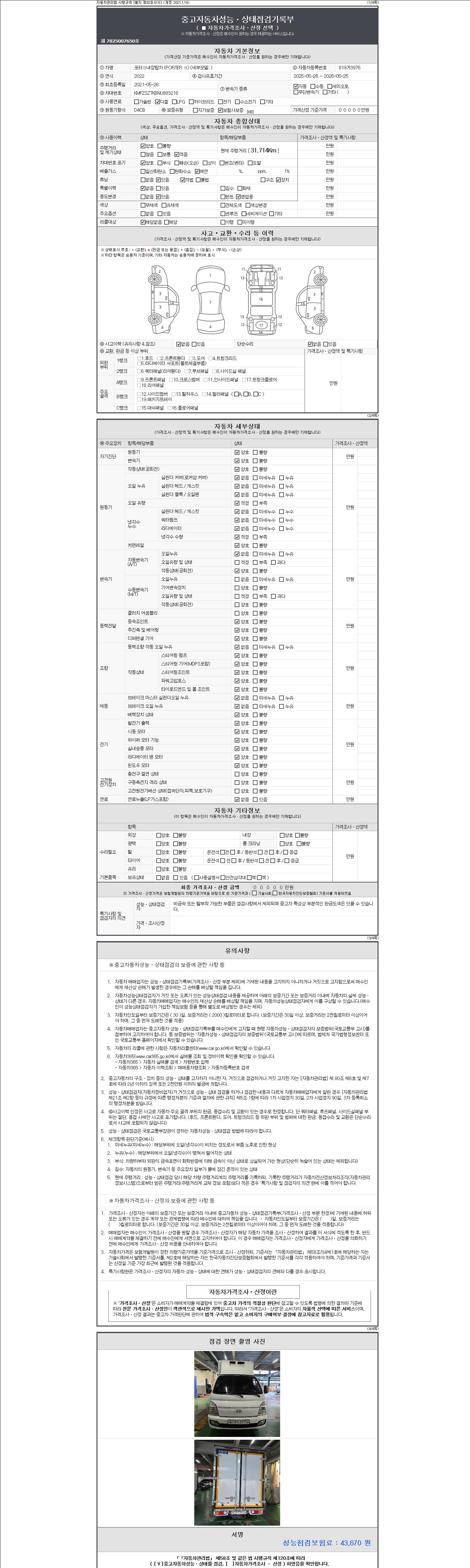 자동차관리법 시행규칙 제120조의 규정에 따라 별지 제 82호서식 《중고자동차 성능, 상태점검 기록부》를 발행한 성능, 상태점검자 및 매매자는 아래의 보증기간 또는 보증거리 이내의 중고자동차, 성능점검 기록부에 기재된 내용과 자동차의 실제 성능, 상태가 다른 경우 계약 또는 관계법령에 따라 매수인에 대하여 책임을 집니다.