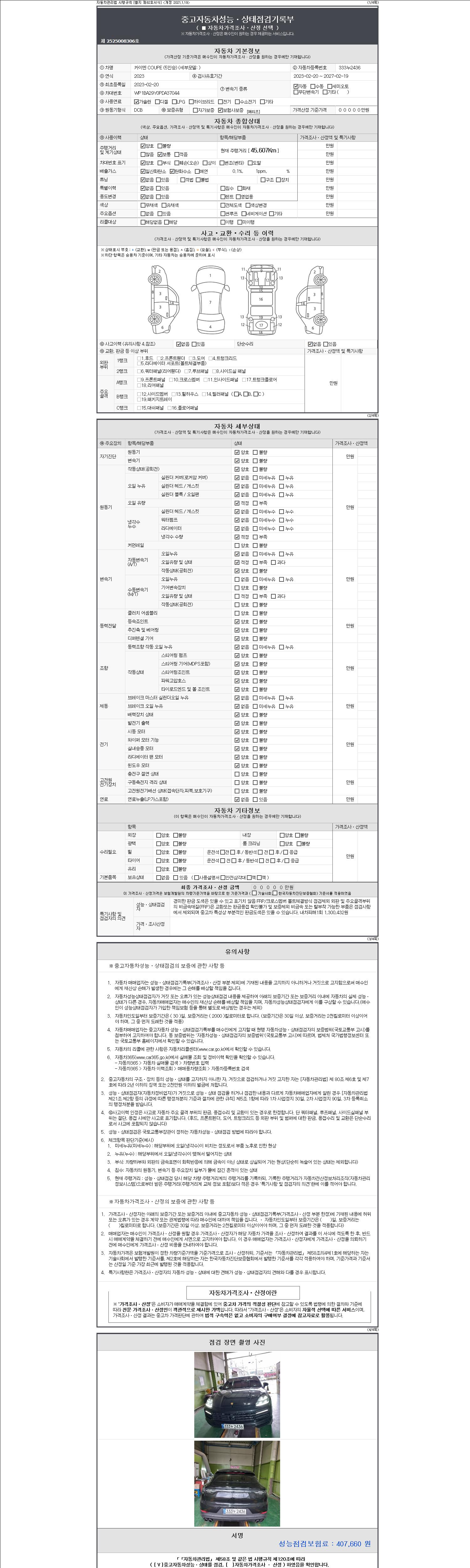 | 주행거리 | 45,607 km | 차량번호 | 333누2436 | 사고유무 | 성능기록부 참조 | 제시번호 | 제 2147483647 호 |