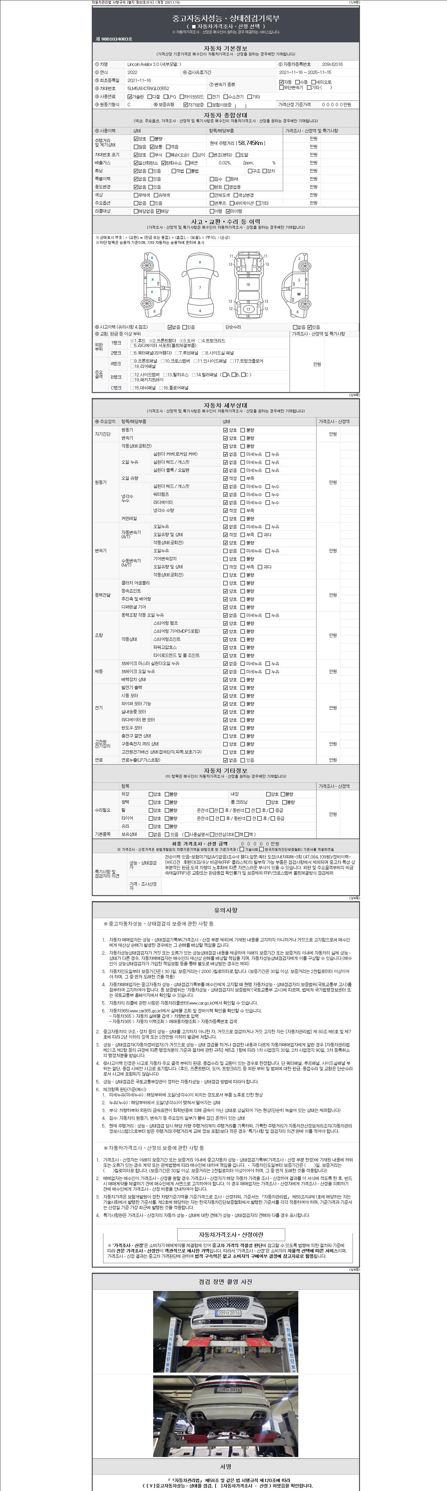 자동차관리법 시행규칙 제120조의 규정에 따라 별지 제 82호서식 《중고자동차 성능, 상태점검 기록부》를 발행한 성능, 상태점검자 및 매매자는 아래의 보증기간 또는 보증거리 이내의 중고자동차, 성능점검 기록부에 기재된 내용과 자동차의 실제 성능, 상태가 다른 경우 계약 또는 관계법령에 따라 매수인에 대하여 책임을 집니다.