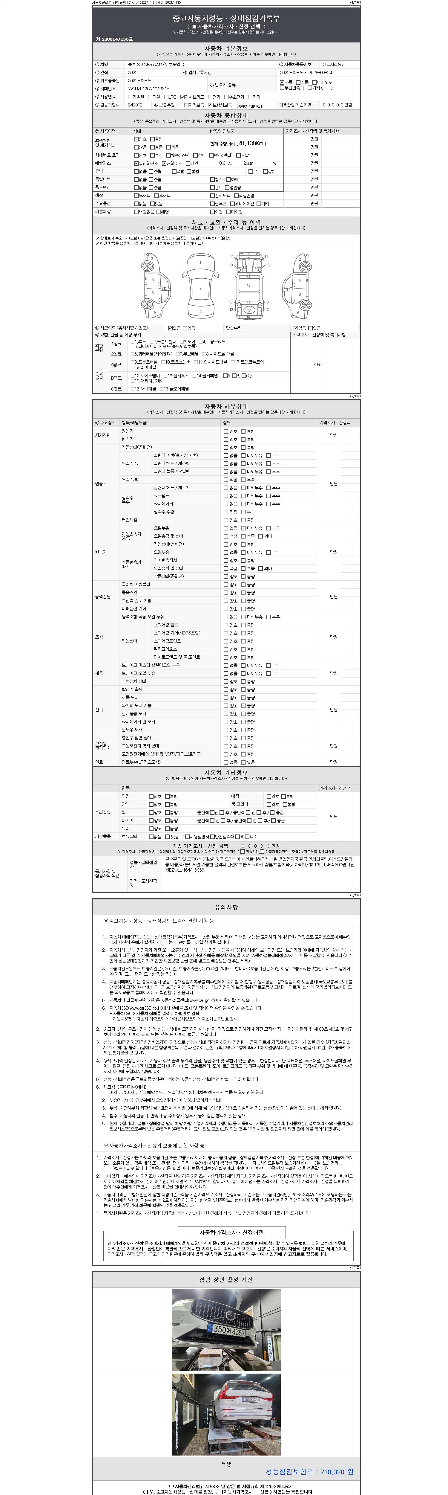 | 주행거리 | 41,130 km | 차량번호 | 350저4357 | 사고유무 | 성능기록부 참조 | 제시번호 | 제 2147483647 호 |