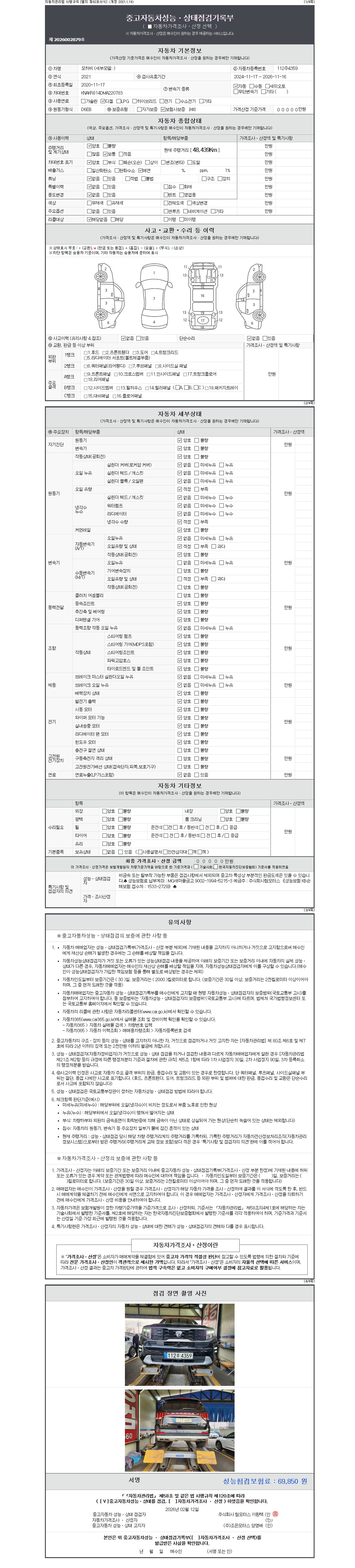 자동차관리법 시행규칙 제120조의 규정에 따라 별지 제 82호서식 《중고자동차 성능, 상태점검 기록부》를 발행한 성능, 상태점검자 및 매매자는 아래의 보증기간 또는 보증거리 이내의 중고자동차, 성능점검 기록부에 기재된 내용과 자동차의 실제 성능, 상태가 다른 경우 계약 또는 관계법령에 따라 매수인에 대하여 책임을 집니다.