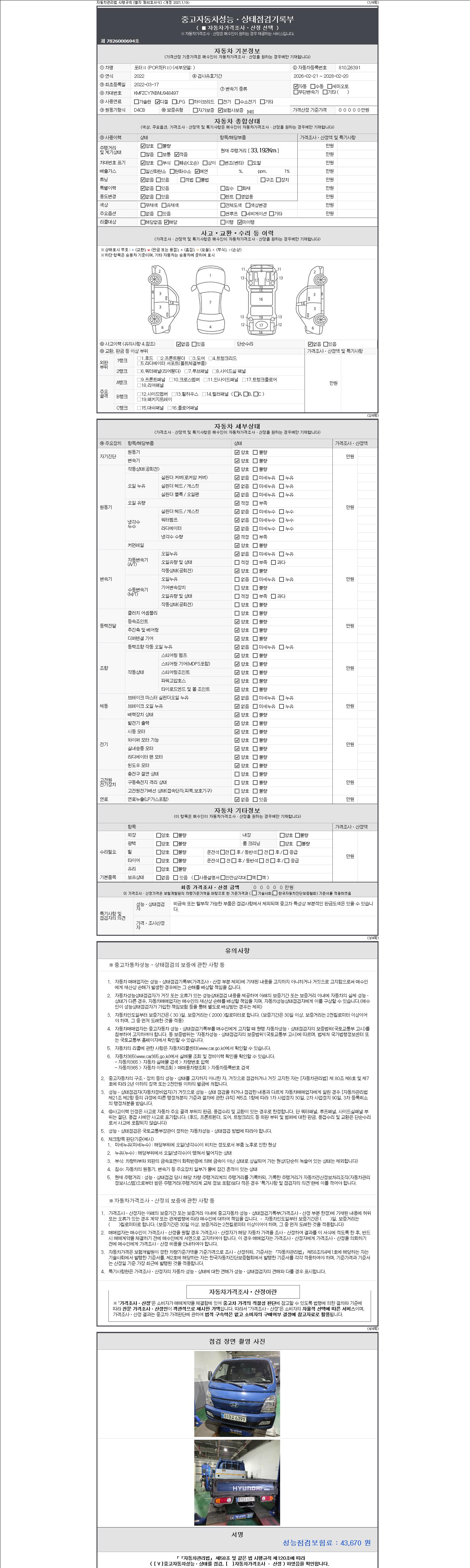 자동차관리법 시행규칙 제120조의 규정에 따라 별지 제 82호서식 《중고자동차 성능, 상태점검 기록부》를 발행한 성능, 상태점검자 및 매매자는 아래의 보증기간 또는 보증거리 이내의 중고자동차, 성능점검 기록부에 기재된 내용과 자동차의 실제 성능, 상태가 다른 경우 계약 또는 관계법령에 따라 매수인에 대하여 책임을 집니다.