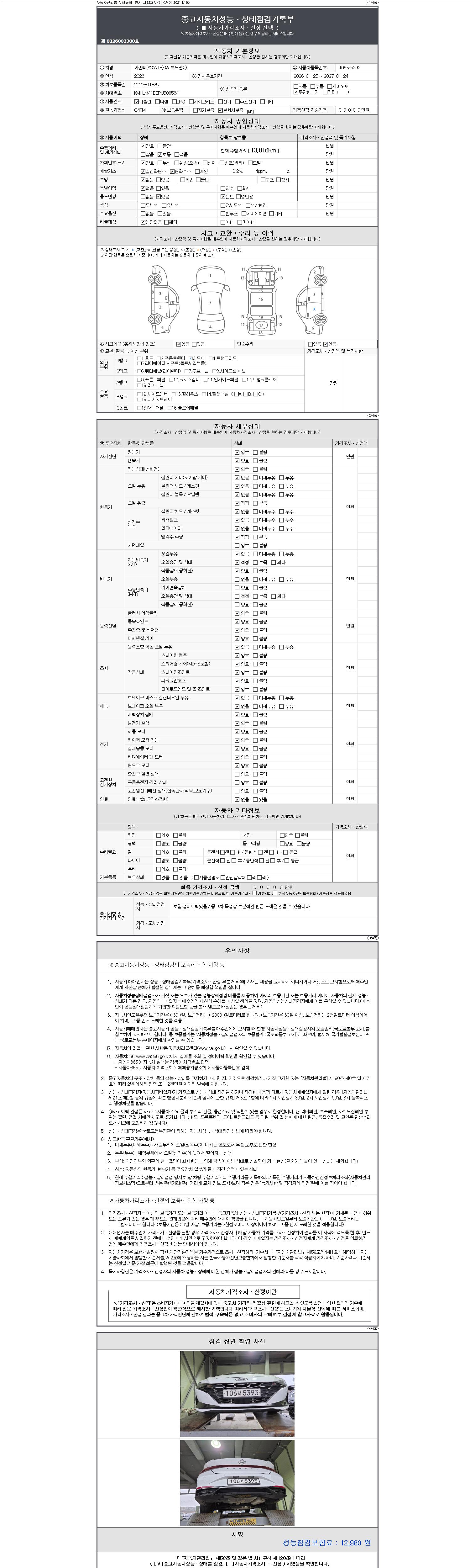 | 주행거리 | 13,816 km | 차량번호 | 106서5393 | 사고유무 | 성능기록부 참조 | 제시번호 | 제 2147483647 호 |
