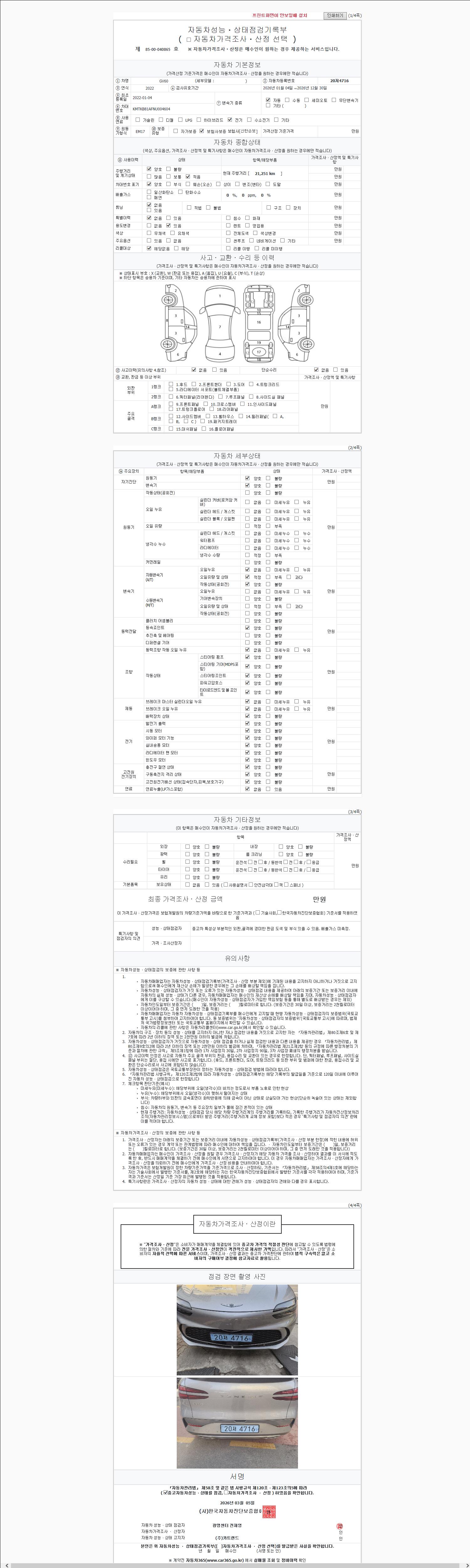 | 주행거리 | 21,251 km | 차량번호 | 20저4716 | 사고유무 | 성능기록부 참조 | 제시번호 | 제 2147483647 호 |