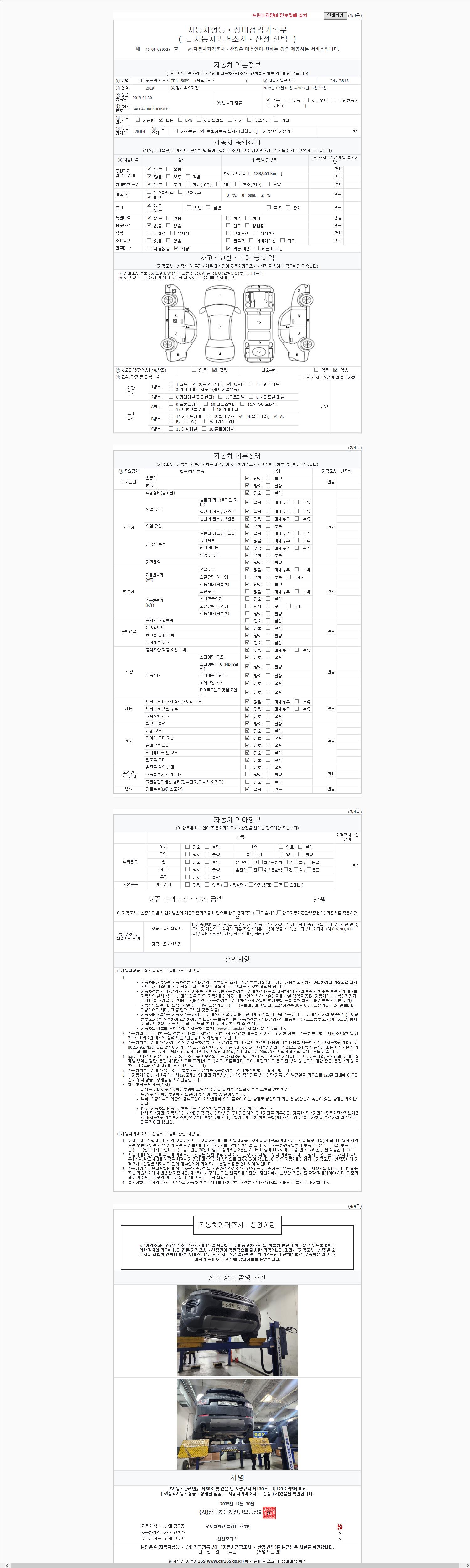 | 주행거리 | 138,961 km | 차량번호 | 34가3613 | 사고유무 | 성능기록부 참조 | 제시번호 | 제 2147483647 호 |
