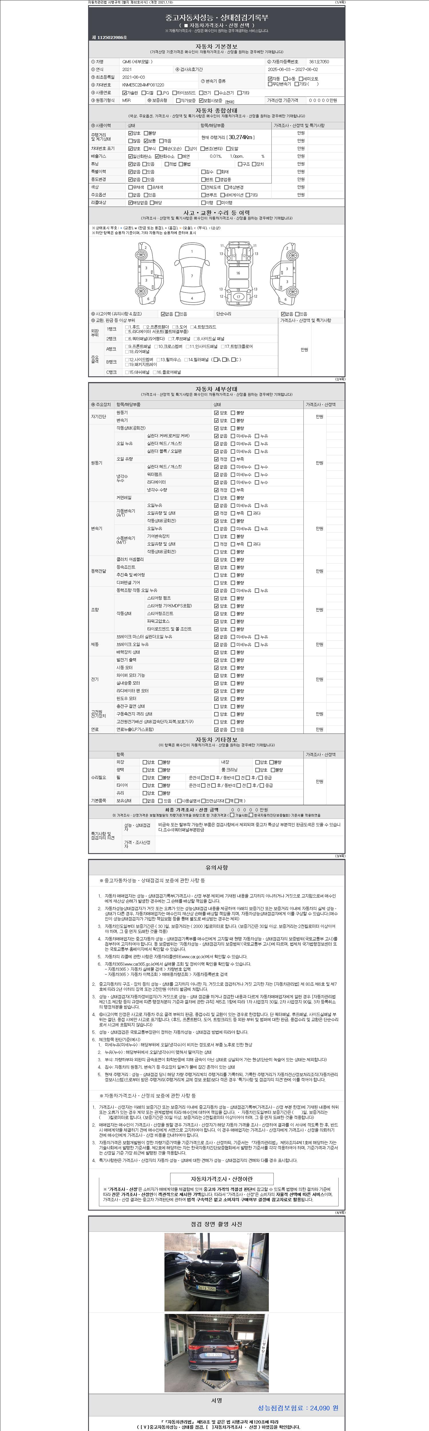 | 주행거리 | 30,274 km | 차량번호 | 361오7050 | 사고유무 | 성능기록부 참조 | 제시번호 | 제 2147483647 호 |