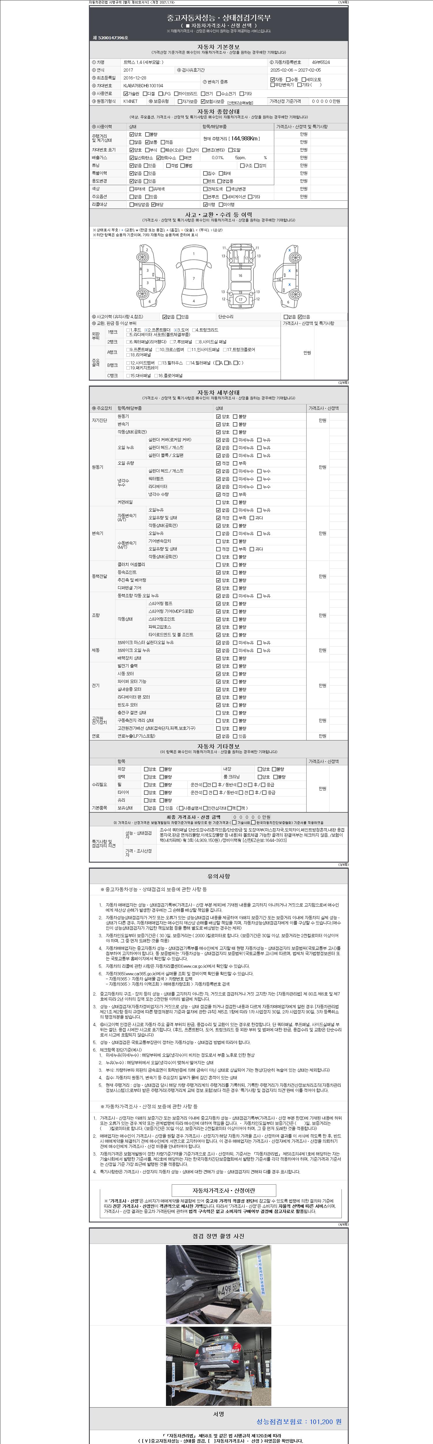 자동차관리법 시행규칙 제120조의 규정에 따라 별지 제 82호서식 《중고자동차 성능, 상태점검 기록부》를 발행한 성능, 상태점검자 및 매매자는 아래의 보증기간 또는 보증거리 이내의 중고자동차, 성능점검 기록부에 기재된 내용과 자동차의 실제 성능, 상태가 다른 경우 계약 또는 관계법령에 따라 매수인에 대하여 책임을 집니다.