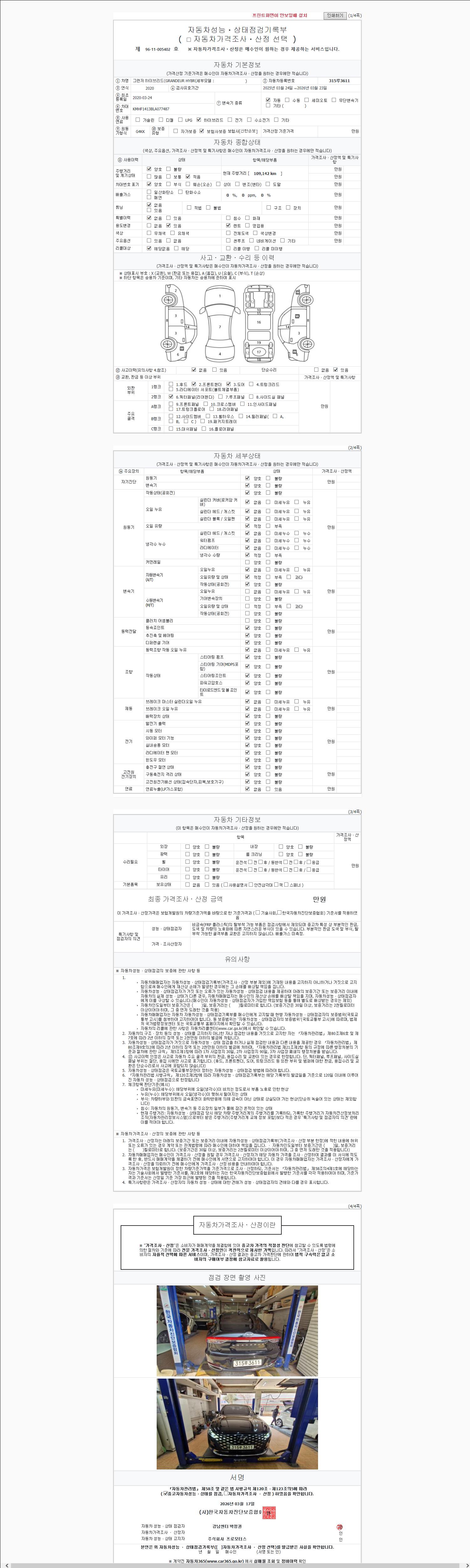 | 주행거리 | 109,145 km | 차량번호 | 315루3611 | 사고유무 | 성능기록부 참조 | 제시번호 | 제 2026032312 호 |