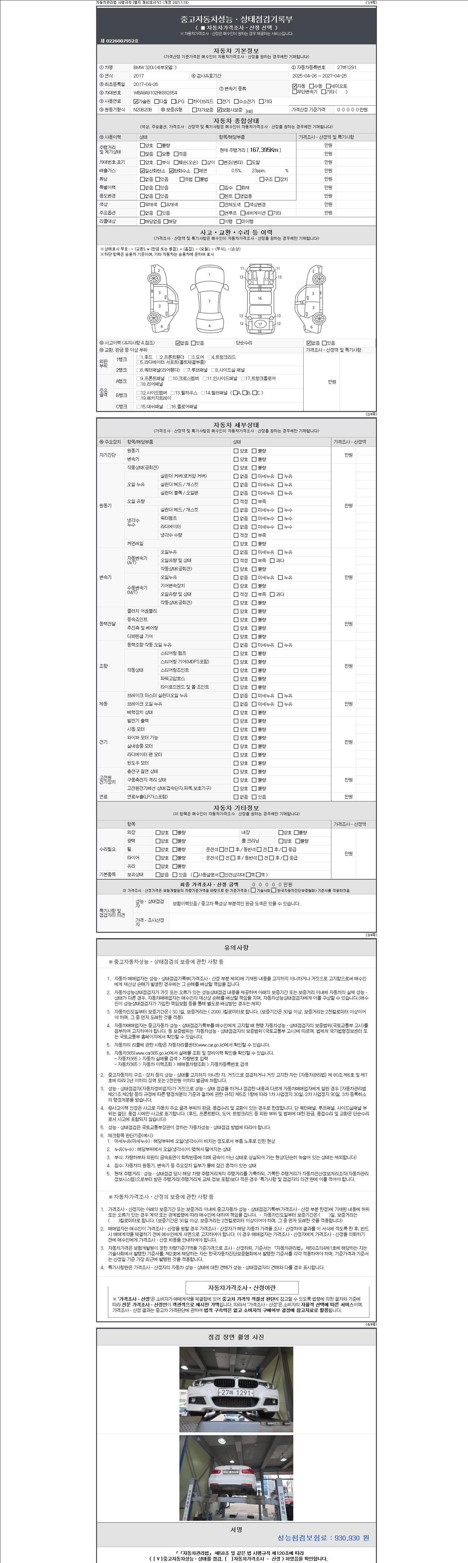 자동차관리법 시행규칙 제120조의 규정에 따라 별지 제 82호서식 《중고자동차 성능, 상태점검 기록부》를 발행한 성능, 상태점검자 및 매매자는 아래의 보증기간 또는 보증거리 이내의 중고자동차, 성능점검 기록부에 기재된 내용과 자동차의 실제 성능, 상태가 다른 경우 계약 또는 관계법령에 따라 매수인에 대하여 책임을 집니다.