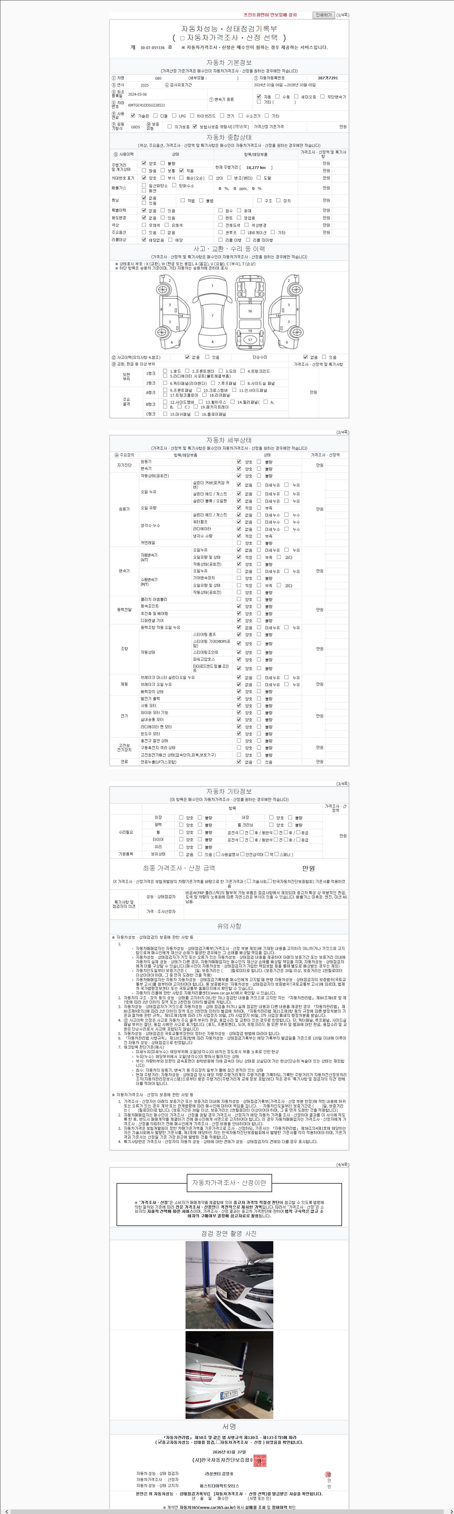 | 주행거리 | 18,277 km | 차량번호 | 287거7291 | 사고유무 | 성능기록부 참조 | 제시번호 | 제 2147483647 호 |