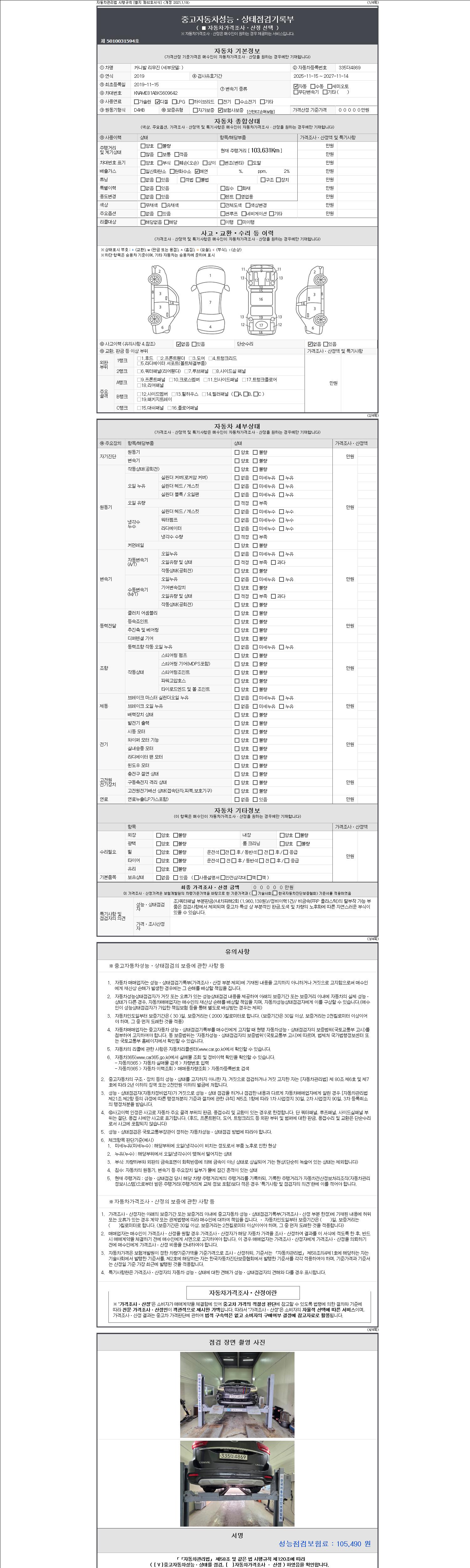 | 주행거리 | 103,631 km | 차량번호 | 335더4869 | 사고유무 | 성능기록부 참조 | 제시번호 | 제 2147483647 호 |