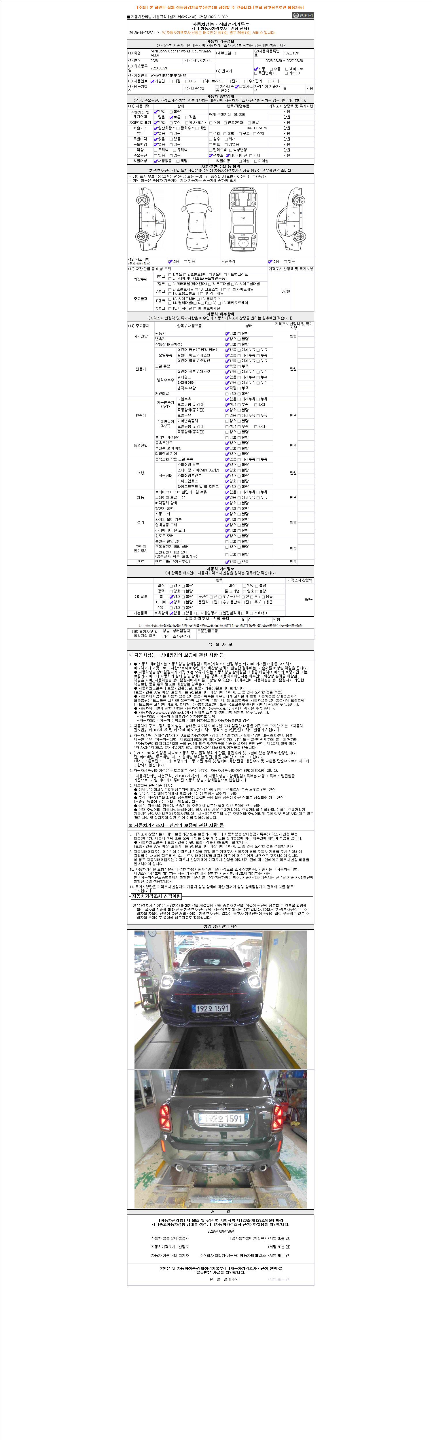자동차관리법 시행규칙 제120조의 규정에 따라 별지 제 82호서식 《중고자동차 성능, 상태점검 기록부》를 발행한 성능, 상태점검자 및 매매자는 아래의 보증기간 또는 보증거리 이내의 중고자동차, 성능점검 기록부에 기재된 내용과 자동차의 실제 성능, 상태가 다른 경우 계약 또는 관계법령에 따라 매수인에 대하여 책임을 집니다.