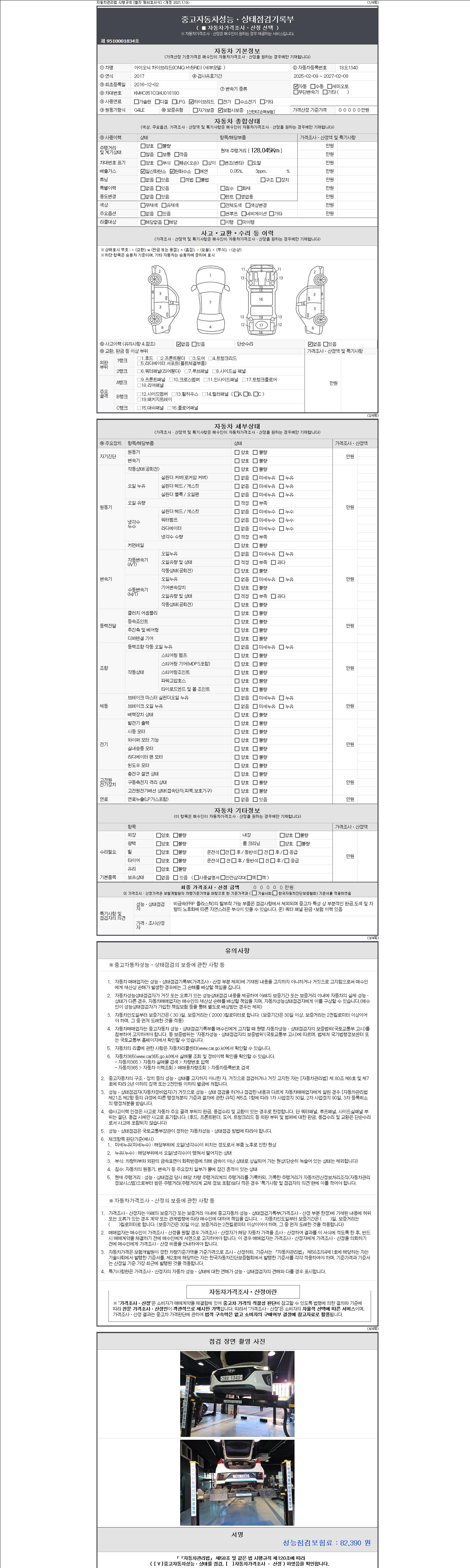 자동차관리법 시행규칙 제120조의 규정에 따라 별지 제 82호서식 《중고자동차 성능, 상태점검 기록부》를 발행한 성능, 상태점검자 및 매매자는 아래의 보증기간 또는 보증거리 이내의 중고자동차, 성능점검 기록부에 기재된 내용과 자동차의 실제 성능, 상태가 다른 경우 계약 또는 관계법령에 따라 매수인에 대하여 책임을 집니다.