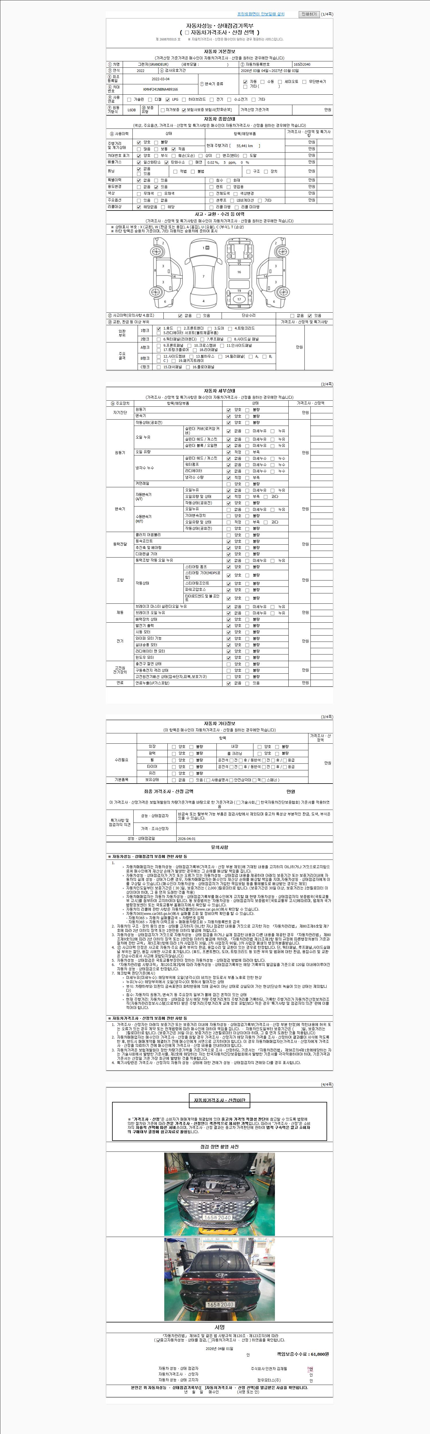| 주행거리 | 55,441 km | 차량번호 | 165라2040 | 사고유무 | 성능기록부 참조 | 제시번호 | 제 2026016977 호 |