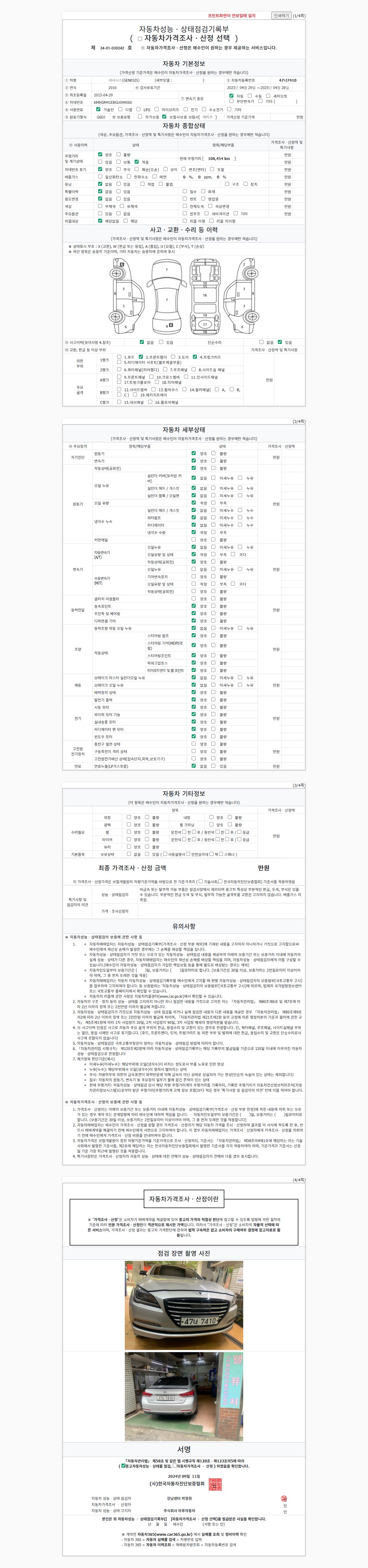 | 주행거리 | 108,454 km | 차량번호 | 47너7410 | 사고유무 | 성능기록부 참조 | 제시번호 | 제 2024110464 호 |