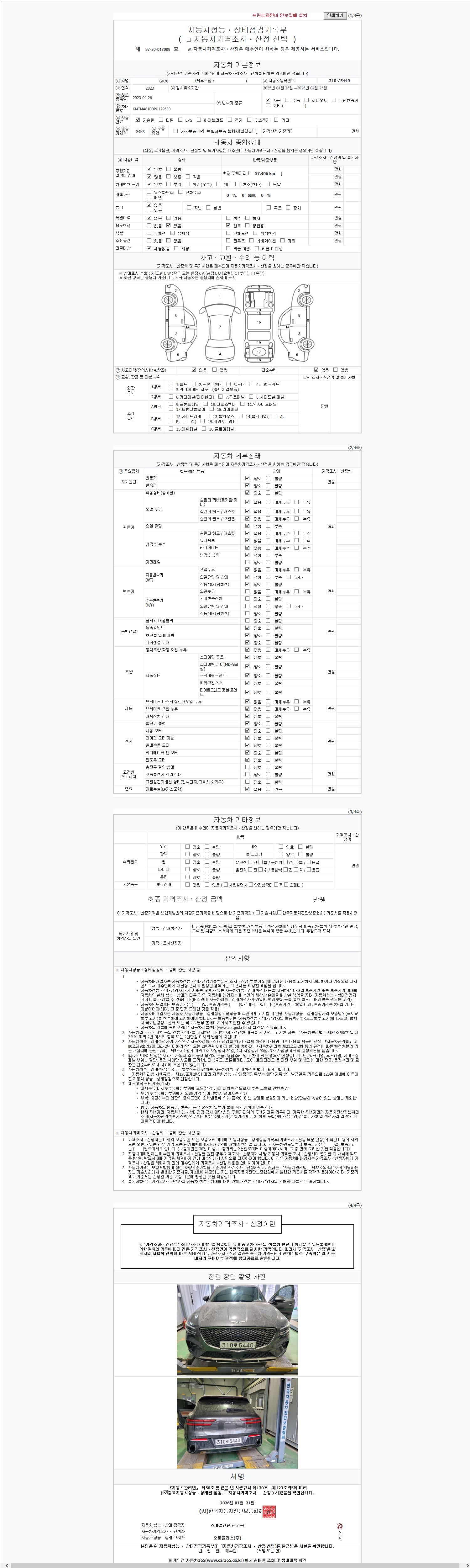 | 주행거리 | 57,406 km | 차량번호 | 310로5440 | 사고유무 | 성능기록부 참조 | 제시번호 | 제 2026002189 호 |