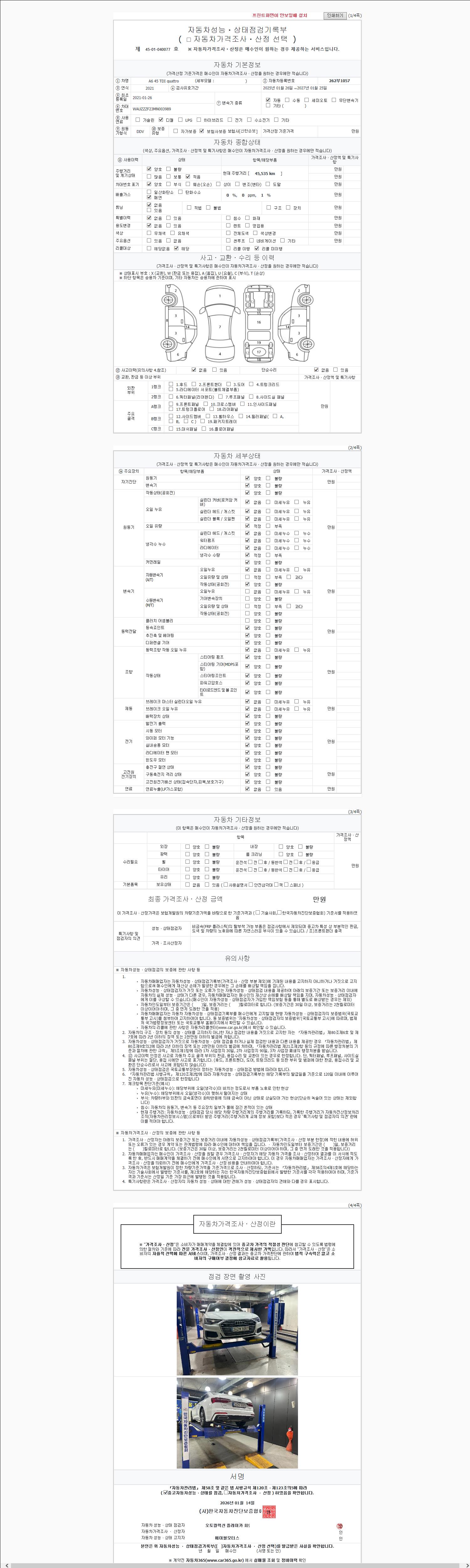| 주행거리 | 45,535 km | 차량번호 | 262부1057 | 사고유무 | 성능기록부 참조 | 제시번호 | 제 2147483647 호 |