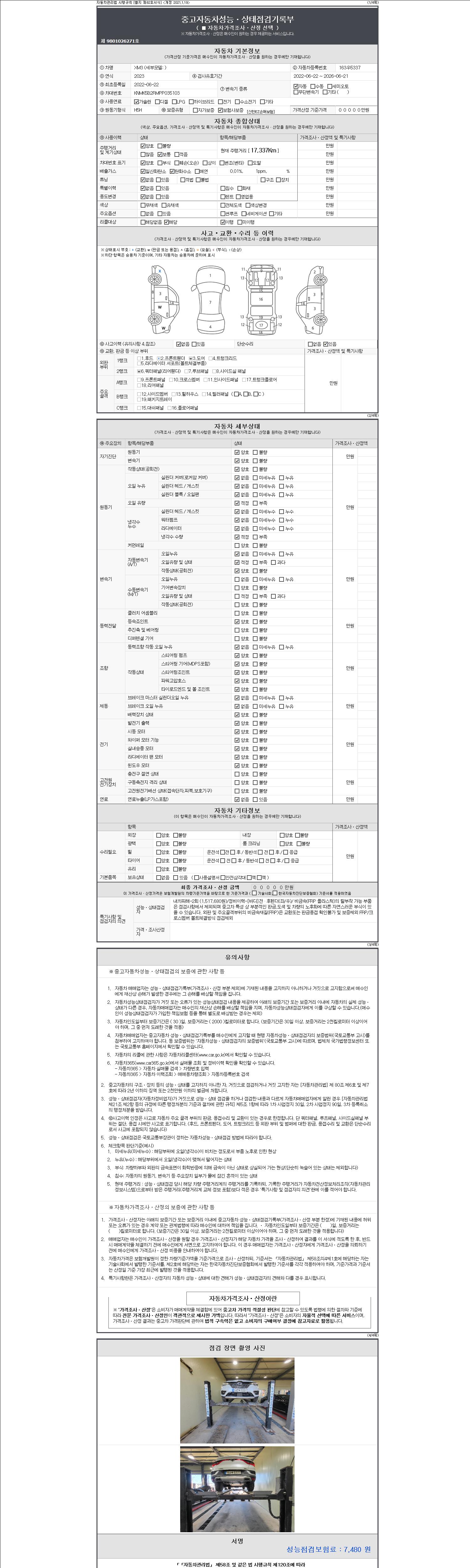 | 주행거리 | 17,337 km | 차량번호 | 163우5337 | 사고유무 | 성능기록부 참조 | 제시번호 | 제 2147483647 호 |
