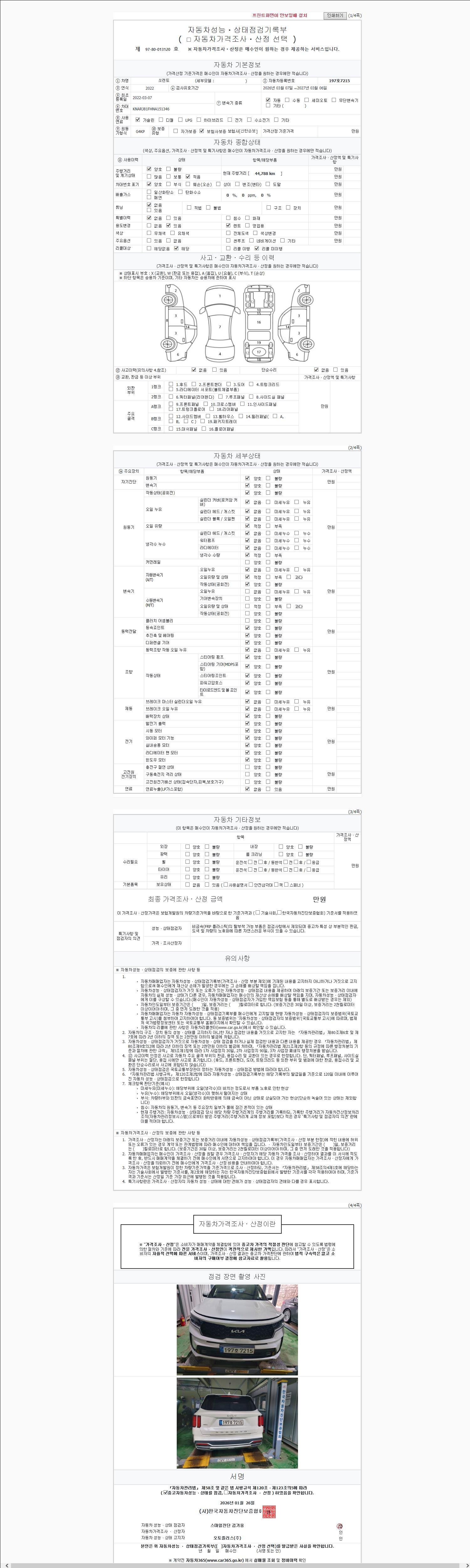 | 주행거리 | 44,788 km | 차량번호 | 197호7215 | 사고유무 | 성능기록부 참조 | 제시번호 | 제 2026002636 호 |