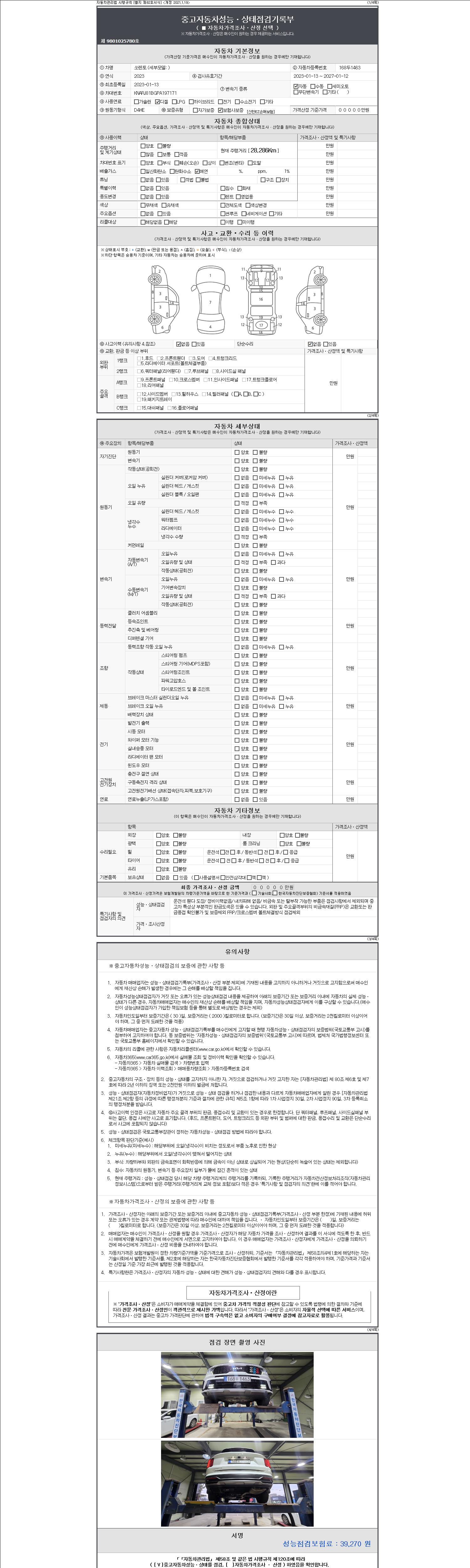 -중고자동차 매매업자를 통해 차량을 구입하실 경우 반드시 "중고자동차 성능, 상태점검 기록부"를 교뷰 받으셔야 하며, 매매업자는 반드시 의무 교부 하여야 압니다.