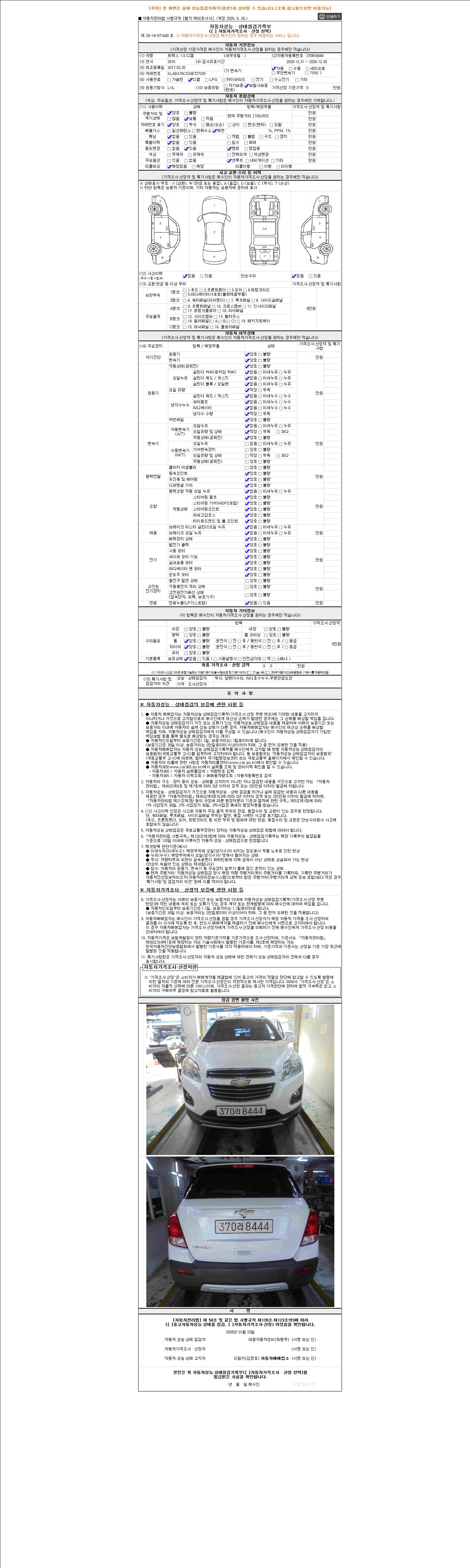 | 주행거리 | 109,130 km | 차량번호 | 370러8444 | 사고유무 | 성능기록부 참조 | 제시번호 | 제 2026002018 호 |